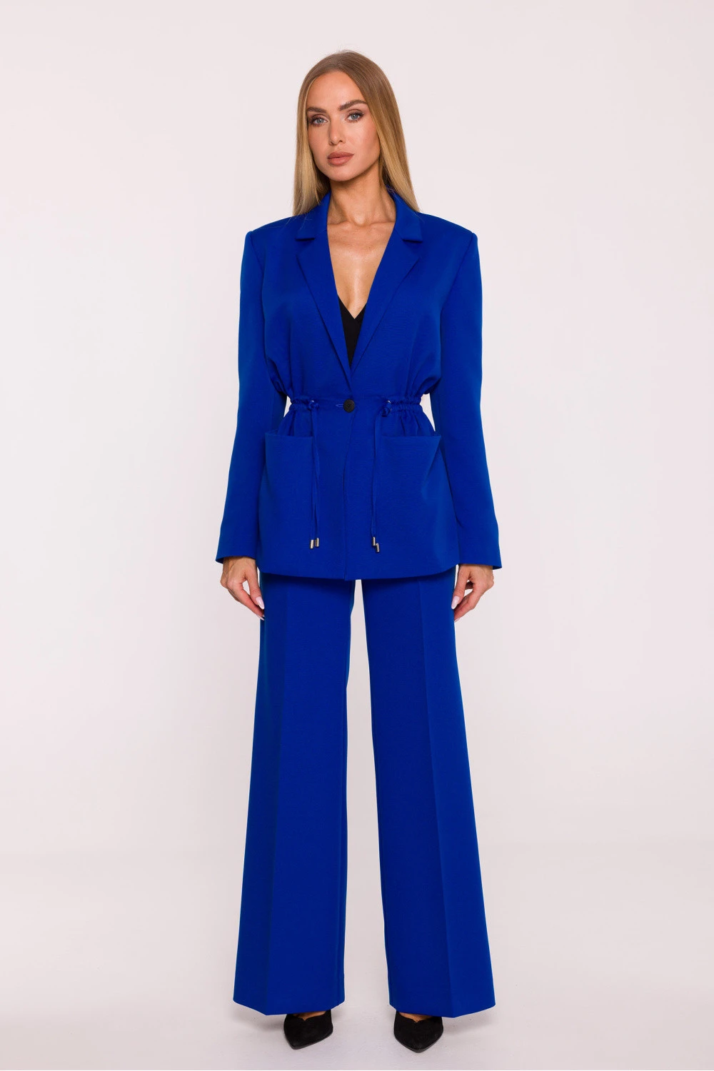 Elegantní dámský sako ušité z hladké látky s matným povrchem spojuje klasiku s moderní funkcionalitou. Volný oversized střih zajišťuje volnost pohybu, a nastavitelný pas s kovovými konci umožňuje přizpůsobit sako postavě, zdůrazňující ženský pas. Model má klasický límec s klopnami a jednoduché zapínání na knoflík, které ve spojení s provázky vytváří elegantní a zároveň moderní dokončení. Dlouhé rukávy bez manžet a velké nášivné kapsy přidávají praktičnost a decentní, ležérní charakter. Sako je kompletně podšité, co zaručuje pohodlí nošení a dokonalé uspořádání látky. Střih s jednoduchým střihem a možností nastavení v pasu dělá z tohoto saka skvělý doplněk jak k elegantním, tak k běžným stylizacím. Navrženo a ušito v Polsku, vytvořeno pro ženy, které oceňují pohodlí, styl a moderní detaily v klasickém provedení.
