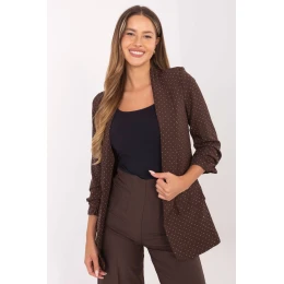 Elegantní dámský sako standardní délky vyrobené z převládající směsi viskózy a polyesteru s podšívkou pro pohodlné nošení. Bez zapínání prezentuje moderní a lehký charakter a vestavěné ramenní polštářky jemně zdůrazňují postavu, dodávají jí výrazné proporce. Celý povrch látky zdobí efektní flitry, které přinášejí jiskru a dělají sako ideální volbou na slavnostní příležitosti nebo večírky. Rukávy délky 3/4 jsou zdobeny jemnými záhyby, co přidává celku ženskou eleganci a originální styl.