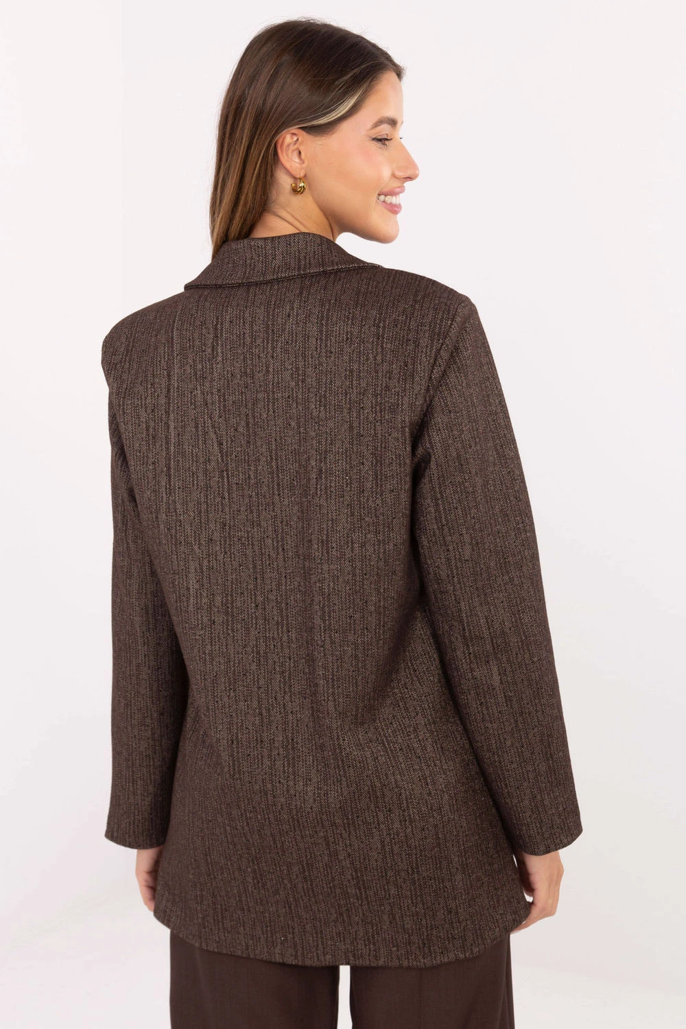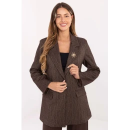 Elegantní a nadčasový dámský sako s klasickým střihem, ideální na společenské události a do práce. Vyrobena z vysoce kvalitní směsi polyesteru, viskózy a elastanu, díky čemuž skvěle padne, poskytuje pohodlí a lehce se přizpůsobuje postavě. Model má standardní délku a dlouhé rukávy, jeho konstrukci zdůrazňují vestavěné polštářky na ramenou, které dávají formě elegantní, lehce znatelný tvar. Obrácené límce a imitace kapes přidávají elegance a šarmu, a zapínání na jediný knoflík decentně zdůrazňuje pas. Sako je podšívané, co zajišťuje pohodlí a ideální přizpůsobení. Celému outfitu dodává šarm dekorativní brož na límci, která je jemným, stylovým akcentem. Jedná se o elegantní sako s nadčasovým charakterem, které skvěle doplní jak společenské stylizace, tak profesionální sestavy do práce. Skvěle vypadá v kombinaci se kalhotami nebo sukní, vytvářející klasický a ženský vzhled.