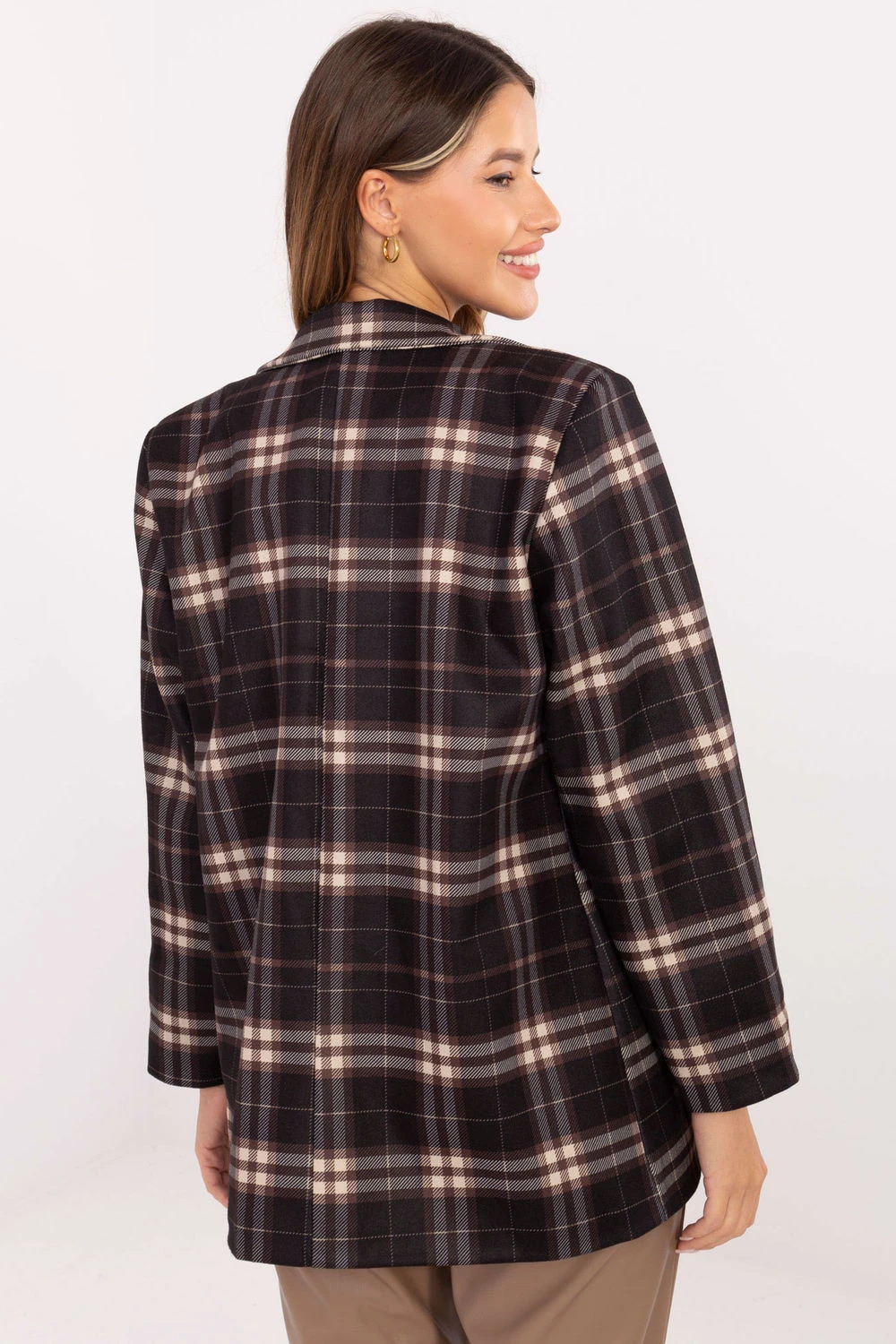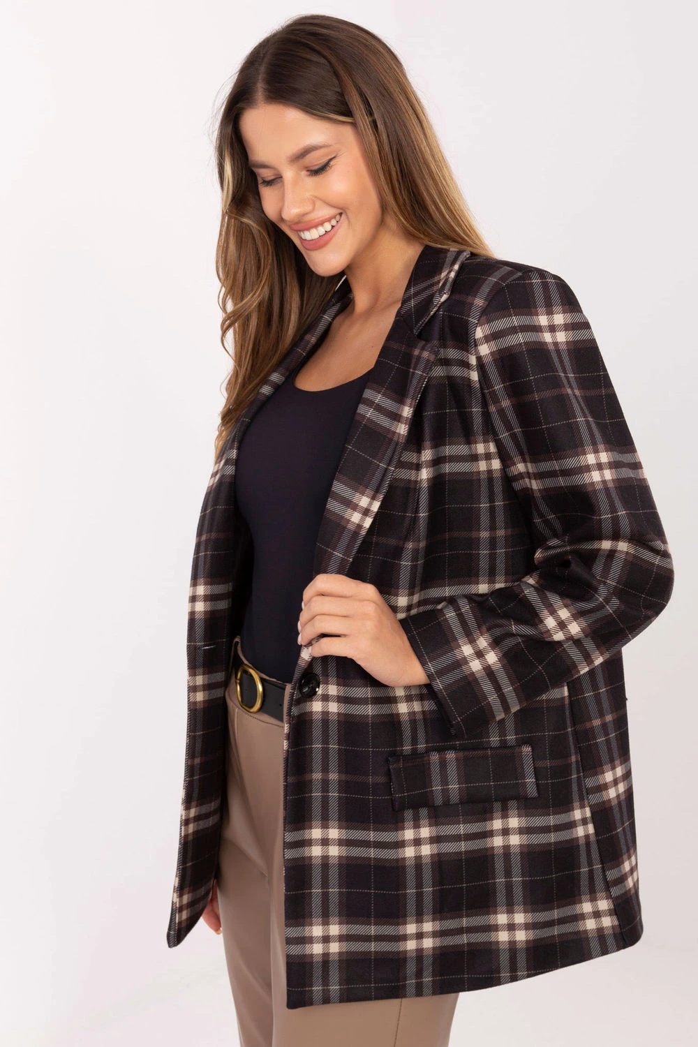 Elegantní a moderní dámský sako v kostkovaném provedení s knoflíkem je kombinací ležérního charakteru s elegancí vhodnou do práce. Vyrobeno z vysoce kvalitní směsi viskózy a polyesteru, poskytuje pohodlí a trvanlivost, a vestavěné polstrování na ramenou dodává siluetě lehce definovaný, elegantní tvar. Model má standardní délku a dlouhé rukávy, a klasický kostkovaný vzor dodává módní, nadčasový akcent do každodenního outfitu. Navíc je sako podšité, co zaručuje pohodlí a estetické provedení. Jedná se o ideální volbu na každodenní nošení, do práce nebo do ležérních, elegantních kombinací, které spojují pohodlí, styl a moderní charakter.