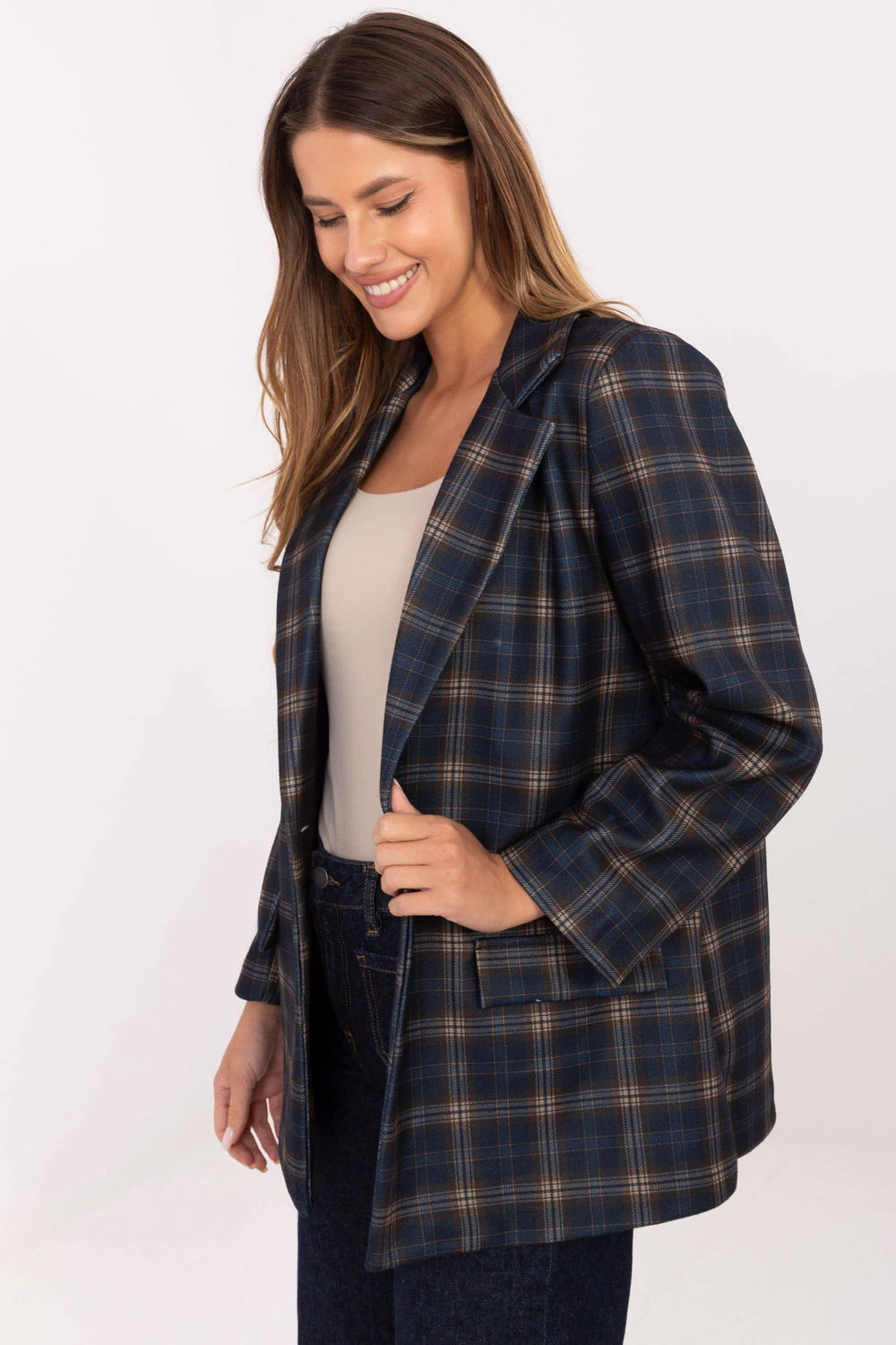 Elegantní a moderní dámský kostkovaný sako s knoflíkem, kombinující neformální charakter s elegancí vhodnou do práce. Vyrobený z vysoce kvalitní směsi viskózy a polyesteru, poskytuje pohodlí nošení a odolnost, a vestavěné polštářky na ramenou dodávají siluetě lehce vystínovaný, elegantní tvar. Model má standardní délku a dlouhé rukávy, a klasický kostkovaný vzor přináší moderní, nadčasový akcent do každodenních stylizací. Navíc je sako na podšívce, co zaručuje pohodlí a estetické dokončení. Je to ideální návrh na každodenní vycházky, do práce nebo do neformálních, elegantních outfitů, které spojují pohodlí, styl a moderní charakter.