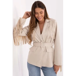Elegantní a jedinečný semišový sako v casualovém stylu, ideální na každý den. Vyrobený z vysoce kvalitní směsi polyesteru a elastanu, je měkký, příjemný na dotek a skvěle se přizpůsobuje postavě. Model standardní délky s dlouhým rukávem a zapínáním na knoflík vypadá elegantně a žensky. Vložené polštářky na ramenou jemně zdůrazňují linii ramen a otočené límce dodávají celku klasický charakter. Sako má podšívku pro pohodlné nošení a zapínací pás, který krásně zdůrazňuje pas. Franže na rukávech a vpředu dodávají saku módní, originální vzhled v duchu boho. Ideální volba pro ženy, které oceňují spojení elegance, pohodlí a neotřelého stylu, skvěle se hodí jak k džínám, tak k šatům.