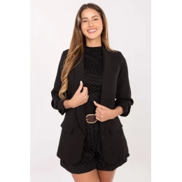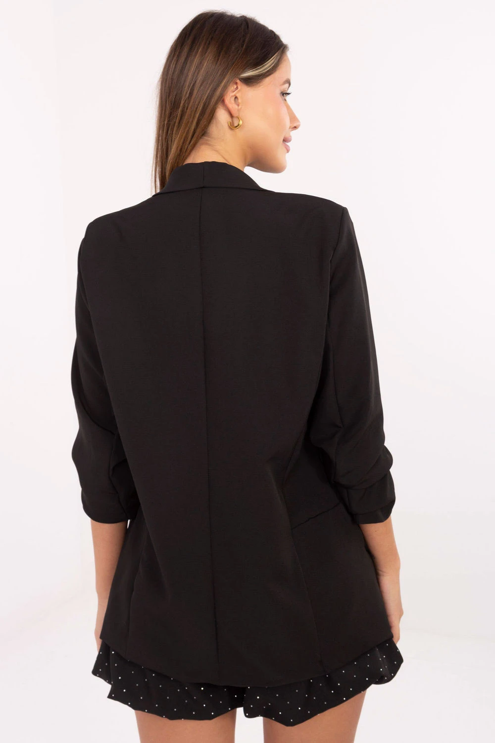 Elegantní dámský sako je klasickým prvkem šatníku, který dodá eleganci každému outfitu, ať už do práce nebo na slavnostní příležitosti. Vyrobený z elastické směsi polyesteru a elastanu skvěle padne a zajistí pohodlí při nošení. Model má vestavěné polštářky na ramenou, které jemně zdůrazňují linii ramen, a záhyby na rukávech dodávají celku moderní charakter a lehkost. Délka 3/4 rukávu a standardní délka dělají z tohoto saka univerzální a stylový kousek do každé situace. Sako bez zapínání s praktickou podšívkou je elegantní základ pro mnoho outfitů od každodenních přes kancelářské až po slavnostní stylizace.