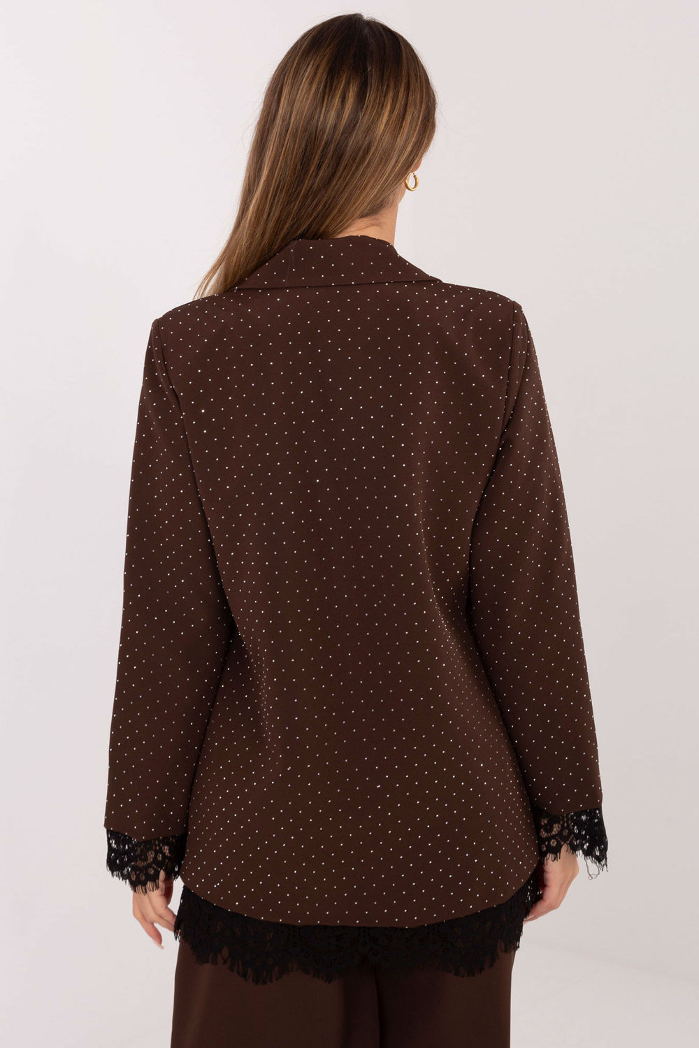 Elegantní dámský sako je skvělou volbou na slavnostní události a stylové večírky, kde záleží na eleganci a efektních detailech. Jeho klasický tvar s límci je obohacen o dekorativní prvky, které dávají celku výjimečný charakter. Model je vyroben z kombinace polyesteru a elastanu, díky čemuž materiál jemně pracuje, poskytuje pohodlí a zároveň vypadá elegantně a upraveně. Sako má také podšívku, která zvyšuje pohodlí nošení a zaručuje vysokou kvalitu zpracování. Na ramenou jsou vsazeny vycpávky, které jemně tvarují siluetu a zdůrazňují formální, slavnostní charakter saka. Efektní aplikace s flitry představuje dominující dekorativní prvek, dodávající lesku a modernosti. Sako má standardní délku a dlouhý rukáv zakončený krajkou dodává celku ženský a jemný výraz. Spodní část saka je také zdobena krajkou, což vytváří souvislý a elegantní efekt. Přední část se zapíná na jednořadé knoflíky, což zdůrazňuje klasický, ale zároveň lehký charakter modelu. Jedná se o stylový návrh pro ženy, které ocení eleganci s nádechem výrazného, večírkového lesku ideální na slavnostní události, večírky a večerní vycházky.