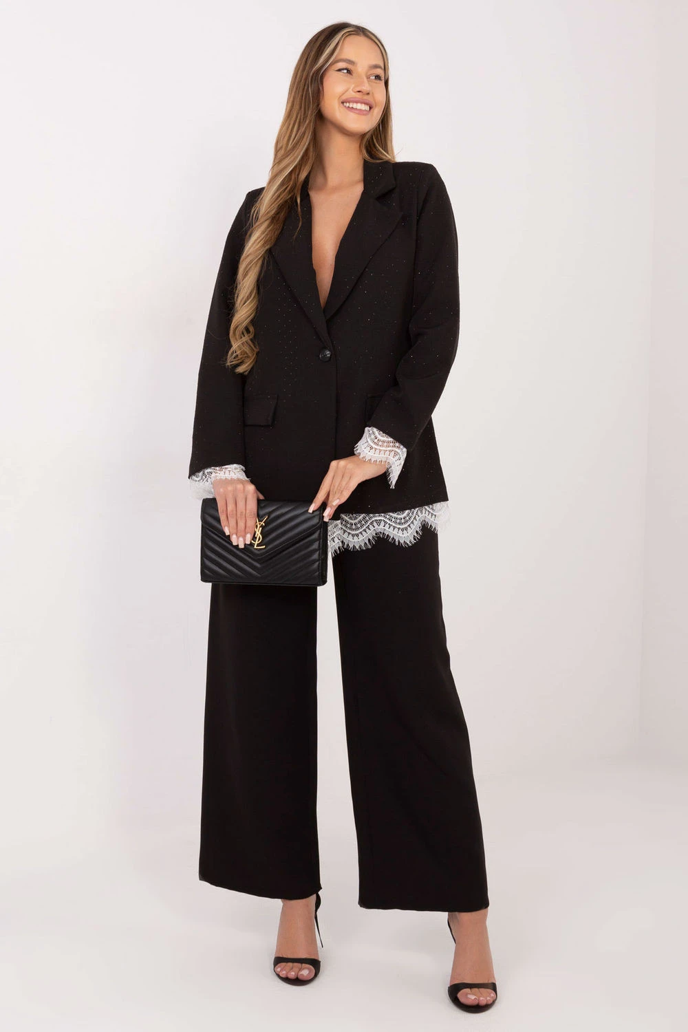 Elegantní dámský sako je skvělou volbou na návštěvy a stylové události, kde záleží na eleganci a efektních detailech. Jeho klasický tvar s límci je doplněn ozdobnými prvky, které celku dodávají jedinečný charakter. Model je vyroben z kombinace polyesteru a elastanu, díky čemuž materiál jemně pracuje, poskytuje pohodlí a zároveň vypadá elegantně a uklizeně. Sako má také podšívku, která zvyšuje pohodlí nošení a zaručuje vysokou kvalitu zpracování. Na ramenou jsou vsazeny polštářky, které jemně modelují siluetu a zdůrazňují formální, návštěvní charakter sak. Efektní aplikace s džety je dominujícím ozdobným prvkem, dodávajícím lesk a modernost. Sako má standardní délku a dlouhý rukáv zakončený krajkou dodává celku ženský a jemný výraz. Spodní část saka je také zdobena krajkou, co vytváří souvislý a elegantní efekt. Přední část se zapíná na knoflík, co zdůrazňuje klasický, ale zároveň lehký charakter modelu. Je to stylová nabídka pro ženy, které oceňují eleganci s nádechem výrazného, večerního lesku ideální na slavnostní události, recepce a večerní vycházky.