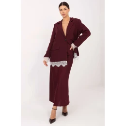 Elegantní dámský sako je skvělou volbou na slavnostní příležitosti a stylové akce, kde záleží na eleganci a efektních detailech. Jeho klasický tvar s límci je obohacen o dekorativní prvky, které dodávají celku jedinečný charakter. Model je vyroben z kombinace polyesteru a elastanu, díky čemuž materiál jemně pracuje, poskytuje pohodlí a zároveň vypadá elegantně a uklizeně. Sako má také podšívku, která zvyšuje pohodlí nošení a zaručuje vysokou kvalitu zpracování. Na ramenou jsou vsazeny polštářky, které jemně modelují postavu a zdůrazňují formální, slavnostní charakter saka. Sako má standardní délku a dlouhý rukáv s krajkou dodává celku ženský a jemný vzhled. Spodní část saka je také zdobena krajkou, což vytváří jednotný a elegantní efekt. Přední díl se zapíná na knoflík, což zdůrazňuje klasický, ale zároveň lehký charakter modelu. Je to stylový návrh pro ženy, které oceňují eleganci, ideální na slavnostní události, večírky a večerní výlety.