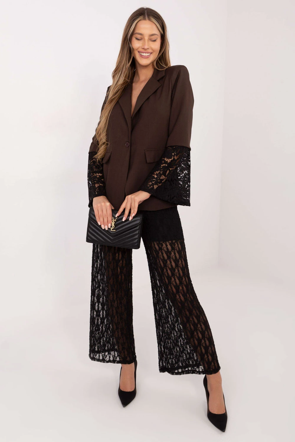 Elegantní dámský sako s hladkým povrchem je stylovým návrhem, který se skvěle hodí jak na slavnostní příležitosti, tak i na večerní vycházky. Vyrobený z vysoce kvalitní směsi polyesteru a elastanu poskytuje pohodlí nošení a ideální přizpůsobení postavě. Model má standardní délku a klasické zapínání na knoflík, které zdůrazňuje jeho nadčasový charakter. Vložené polštářky na ramenou dodávají saku výraznost, elegantně tvarují ramenní linii. Výjimečným prvkem je rukáv, od lokte vyrobený z jemné krajky, která do celku vnáší jemný, ženský prvek a dodává celku nezaměnitelný šarm. Je to ideální volba pro ty, kteří ocení eleganci s nádechem originality.