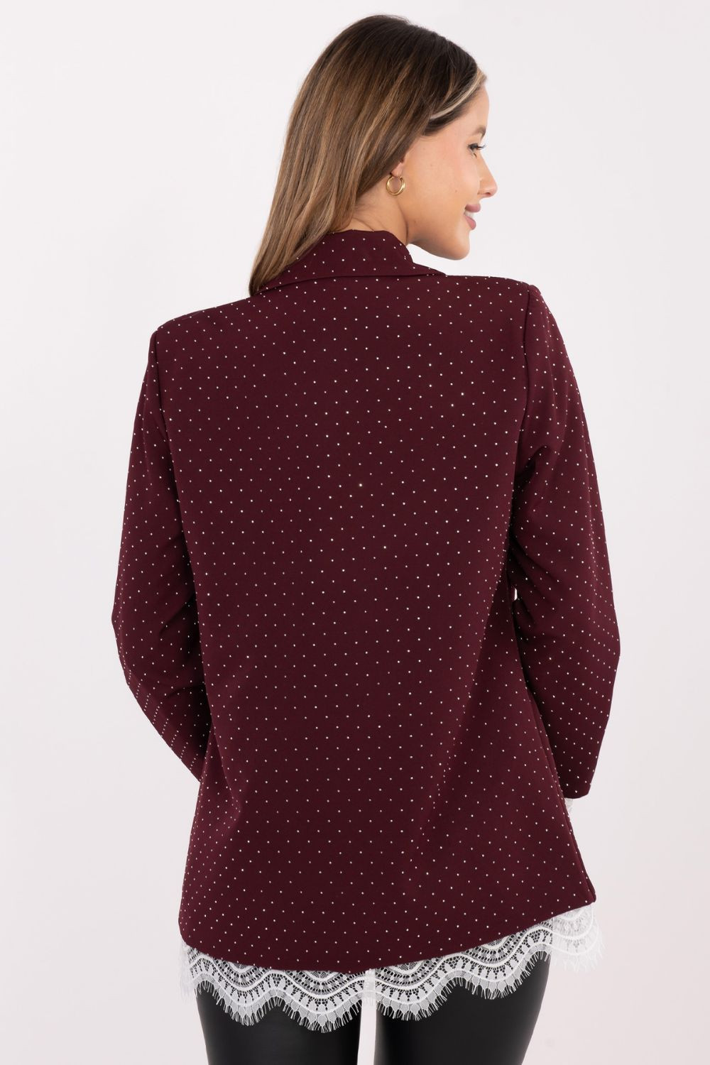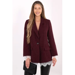 Elegantní dámský sako je výjimečnou nabídkou pro návštěvy a společenské události, ideální pro ženy, které ocení styl a efektní detaily. Model standardní délky okouzluje pečlivým zpracováním a rafinovaným charakterem. Sako má skládací límce, vestavěné ramenní polštářky a jednořadé zapínání na knoflík, které zdůrazňují klasický tvar a elegantní linii siluety. Celou plochu látky zdobí aplikace z flitrů, dodávající celku luxusní bižuterní efekt a přitahující pohled. Zvláštním akcentem je krajkové zakončení dolní části saka a u dlouhých rukávů, které přidává lehkosti a ženského šarmu. Model vyrobený z kombinace polyesteru a elastanu zaručuje pohodlí nošení a dobrou přiléhavost k postavě. Podšívka zvyšuje pohodlí a zajišťuje, že sako skvěle sedí na těle. Jedná se o skvělou volbu pro ženy hledající elegantní a zároveň efektní sako na výjimečné příležitosti.