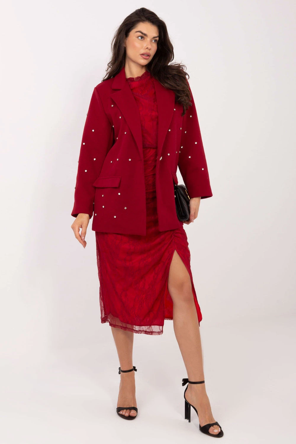 Elegantní dámský sako s elegancí, který byl vytvořen s ohledem na návštěvy a párty stylizace. Model se vyznačuje jedinečným zdobením, zirkony umístěné na přední straně sak a na rukávech, které jí dodávají luxusní lesk a upoutají pozornost. Sako bylo vyrobeno z kombinace polyesteru a viskózy, co zajišťuje trvanlivost materiálu, estetický vzhled a pohodlné nošení. Standardní délka zajišťuje univerzální střih, který se skvěle hodí jak k šatům, tak k elegantním kalhotám. Rozložené límce zdůrazňují klasický charakter modelu, a vestavěné ramenní polštářky dodávají siluetě výraznou formu a elegantní proporce. Model má podšívku, díky čemuž se skvěle přizpůsobuje tělu a zaručuje pohodlí po celou dobu nošení. Je to ideální volba pro ženy, které chtějí svým stylizacím přidat výjimečný šarm a lesk.