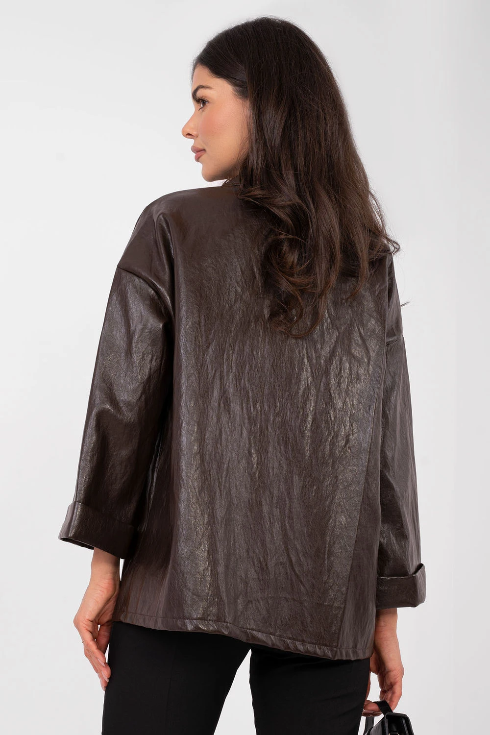 Moderní dámský kabát z ekokože je stylovým návrhem pro každodenní i kancelářské outfit. Vyrobený z vysoce kvalitního materiálu, který kombinuje viskózu a polyuretan, vypadá elegantně a zároveň je pohodlný na nošení. Model s standardní délkou má sklápěcí límečky, které zdůrazňují klasický střih. Dvojřadé knoflíky dodávají kabátu výrazný, moderní charakter. Imitace kapes slouží jako dekorace, zachovávajíc čistou, hladkou linii vpředu. Kabát má dlouhé rukávy, není vyztužený ani vycpávaný, což z něj dělá skvělý kousek na vrstvené outfity v jarní / podzimní / zimní sezóně. Hladký vzor ho činí univerzálním a snadno kombinovatelným jak s látkovými kalhotami, tak s džínami nebo šaty. Je to ideální volba pro ženy, které ocení moderní styl, eleganci a nadčasový design.