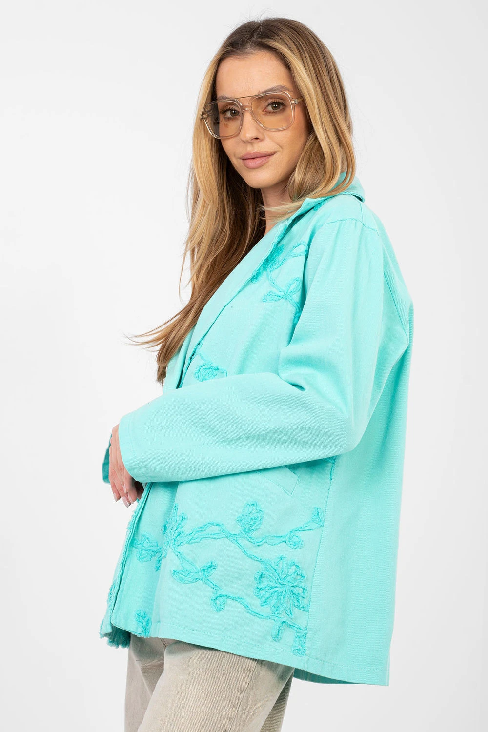 Kazualní dámský sako vyrobené z vysoce kvalitní bavlny, ideální pro každodenní stylování. Džínová látka dodává saku uvolněný charakter, zároveň však dělá model nadčasový a univerzální. Sako má standardní délku, dlouhý rukáv a klasické skládané límce. Výjimečným prvkem jsou vyšívané květiny umístěné na přední straně, které dodávají celku ženský a originální vzhled. Model se zapíná na knoflík, je vybaven praktickými kapsami a kombinuje estetiku s funkcionalitou. Skvělá volba na každý den, skvěle se hodí jak k džínám, tak k šaty nebo sukní.