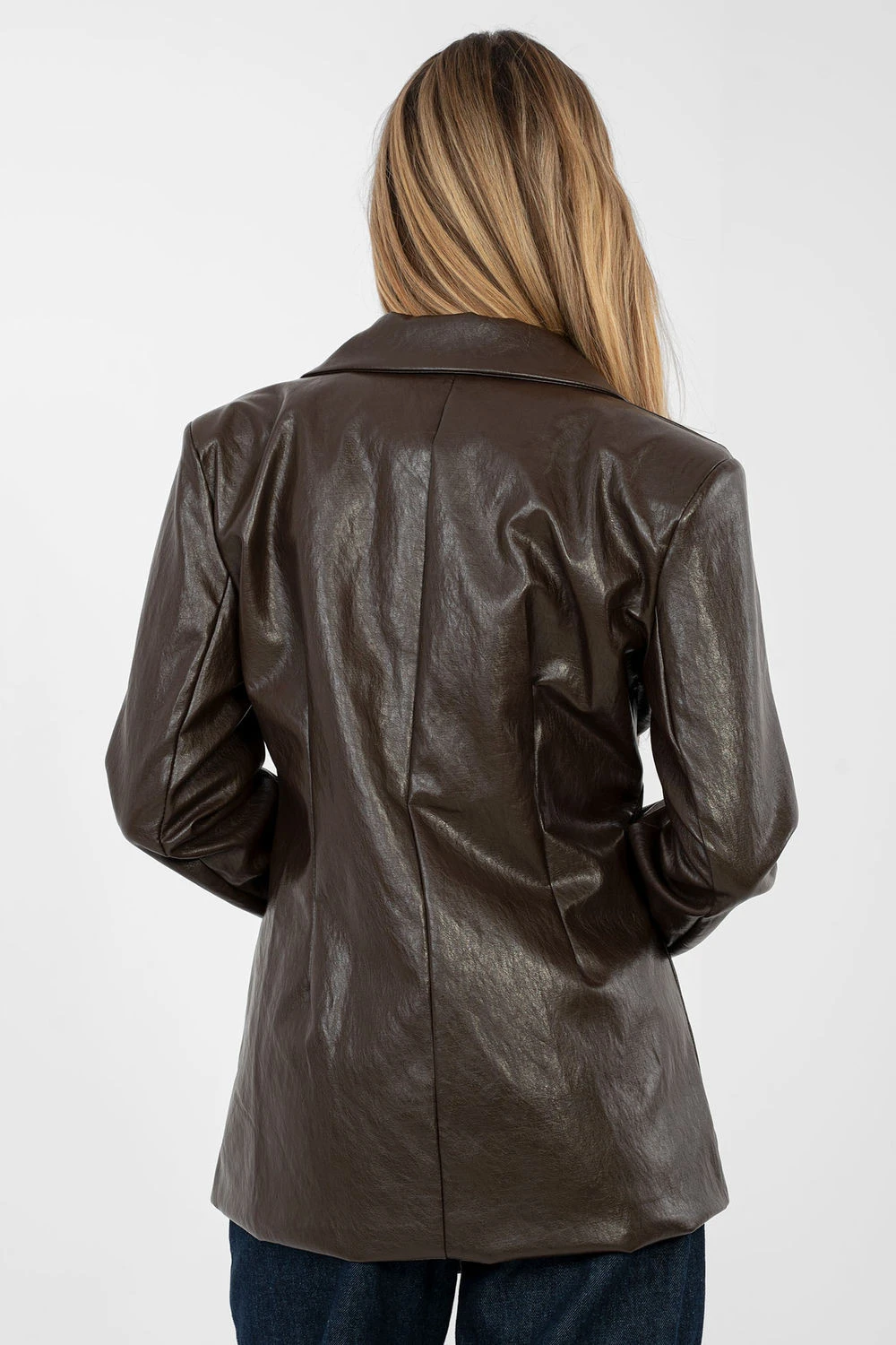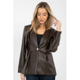 Elegantní dámský sako vyrobené z vysoce kvalitní ekokože na bázi viskózy a polyuretanu, navržené s ohledem na výstavní stylizace. Hladký materiál zdůrazňuje moderní a nadčasový charakter modelu, a standardní délka zajišťuje klasické proporce. Sako má skládané límce a efektní kontrafałdy vpředu, které dodávají siluetě výraz a elegantní formu. Zapíná se na knoflík, je vybaveno podšívkou, což zaručuje pohodlí nošení a estetické přizpůsobení. Všité polštářky na ramenou jemně modelují linii ramen, přidávají celku eleganci a profesionální vzhled. Je to ideální volba pro formální a výstavní sestavy, jak s kalhotami, tak s sukní nebo šaty.