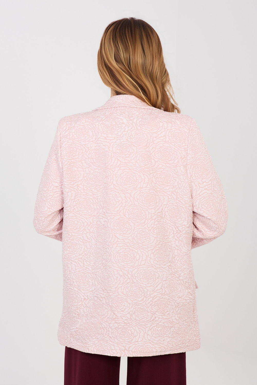 Elegantní dámský sako standardní délky, které skvěle kombinuje klasiku s jemnou náladou originality. Model se vyznačuje různorodou fakturou materiálu a efektním tiskem květin, který celku dodává výjimečný ženský charakter. Vyrobeno z vysoce kvalitní směsi polyesteru a viskózy, zaručuje pohodlí nošení, trvanlivost a estetický vzhled po dlouhou dobu. Dlouhý rukáv a klopy zdůrazňují nadčasový střih, a jednořadé zapínání na knoflík dodává eleganci a univerzálnost. Sako má podšívku, díky čemuž se skvěle přizpůsobuje postavě a zaručuje pohodlí při nošení. Je to ideální volba jak pro kancelářské stylizace, tak na speciální příležitosti, kdy chcete vypadat stylově a elegantně.