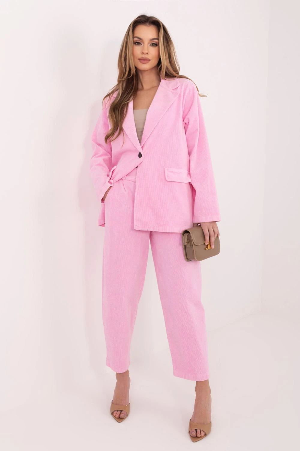 Elegantní dámský kordový sako v casual stylu, který se skvěle hodí jak do každodenního nošení, tak do práce. Tento model spojuje volnost s elegancí, díky čemuž ho snadno zkombinujete s mnoha styly, od klasických látkových kalhot po džíny nebo tužkovou sukni. Vyrobený z vysoce kvalitní bavlny s přídavkem elastanu, poskytuje pohodlí nošení a jemnou pružnost, co se promítá ve pohodlí po celý den. Hladký vzor zdůrazňuje jeho univerzální charakter, a kordová textura dodává jemnou strukturu a moderní akcent. Model má dlouhý rukáv a klasické rozkročené límce, které dodávají saku nadčasový styl. Standardní délka se dobře skládá na postavě, a jednořadé zapínání na knoflík zdůrazňuje elegantní střih. Imitace kapes jsou estetickým zakončením, zachovávajícím minimalistický charakter projektu. Je to ideální nabídka pro ženy, které ocení pohodlí, styl a funkčnost v každodenních i pracovních stylizacích.