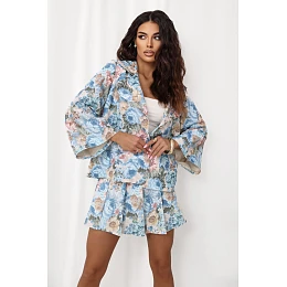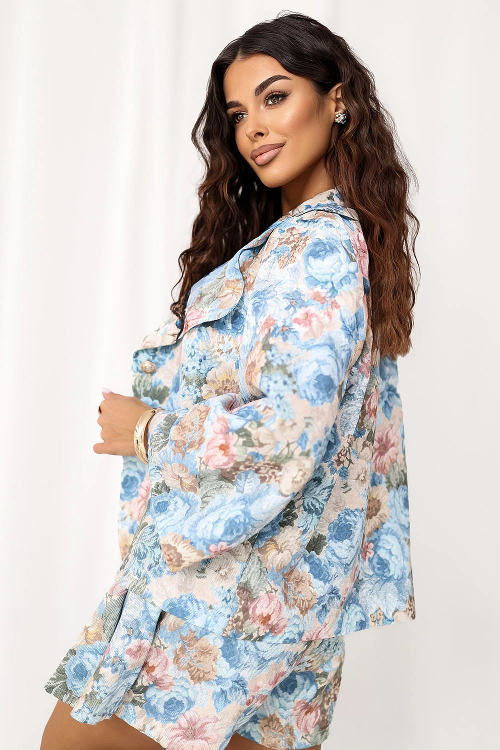 Elegantní dámský žaket s výjimečným květinovým potiskem, který skvěle kombinuje klasiku s moderním stylem. Ideální na různé příležitosti, hodí se jak do práce, na schůzky, tak i na večírky, přidávající ženský charakter outfitu. Střih krásně zdůrazňuje postavu, a jednořadé zapínání na dva knoflíky dodává celku nadčasovou eleganci. Široké rukávy délky 3/4 přinášejí lehkost a jemný módní akcent. Model vyrobený z kvalitní směsi polyesteru a elastanu zaručuje pohodlí nošení a dobře padne k postavě. Žaket má podšívku, co zvyšuje pohodlí při nošení a dělá, že se skvěle přizpůsobuje tělu.