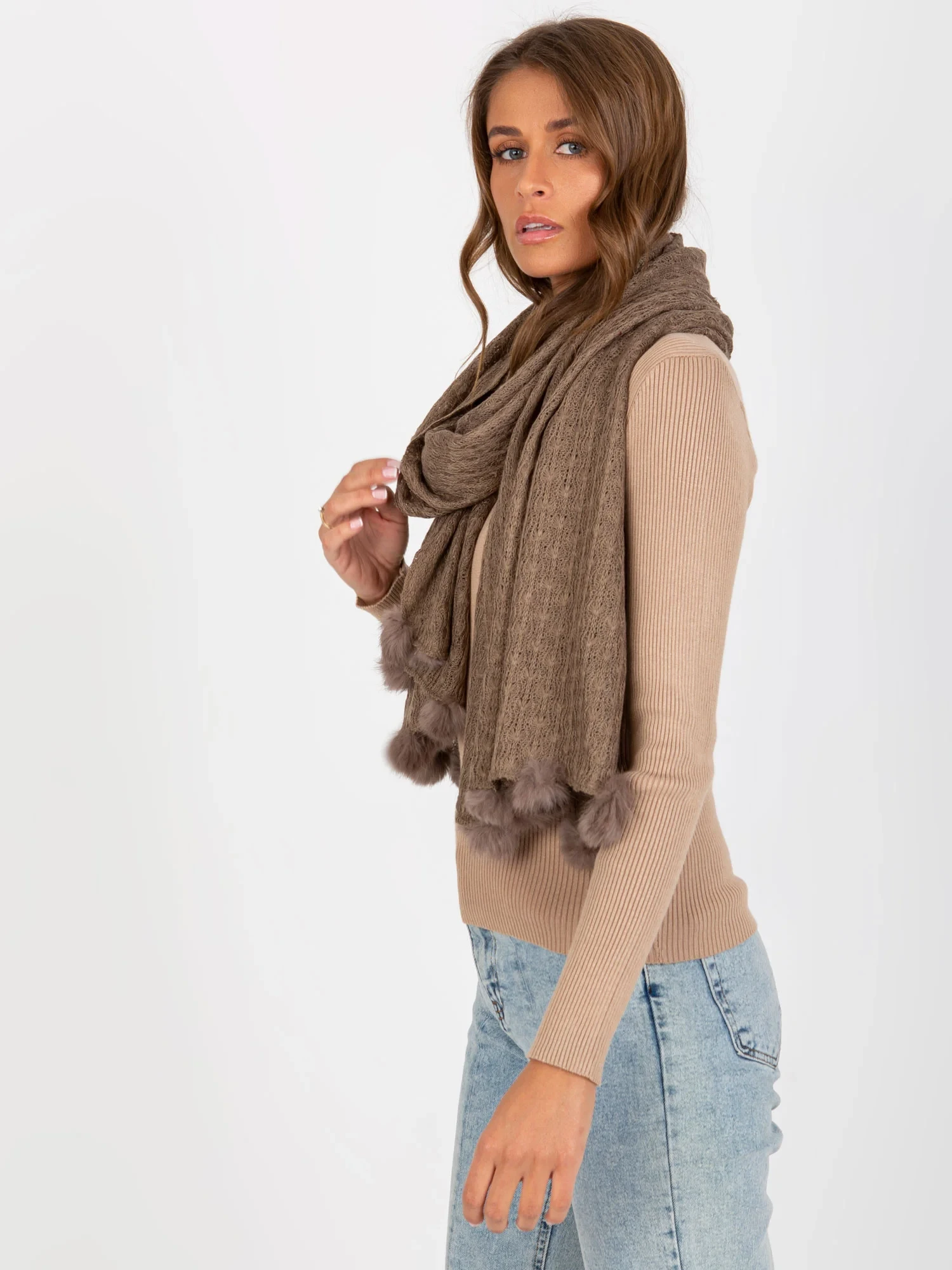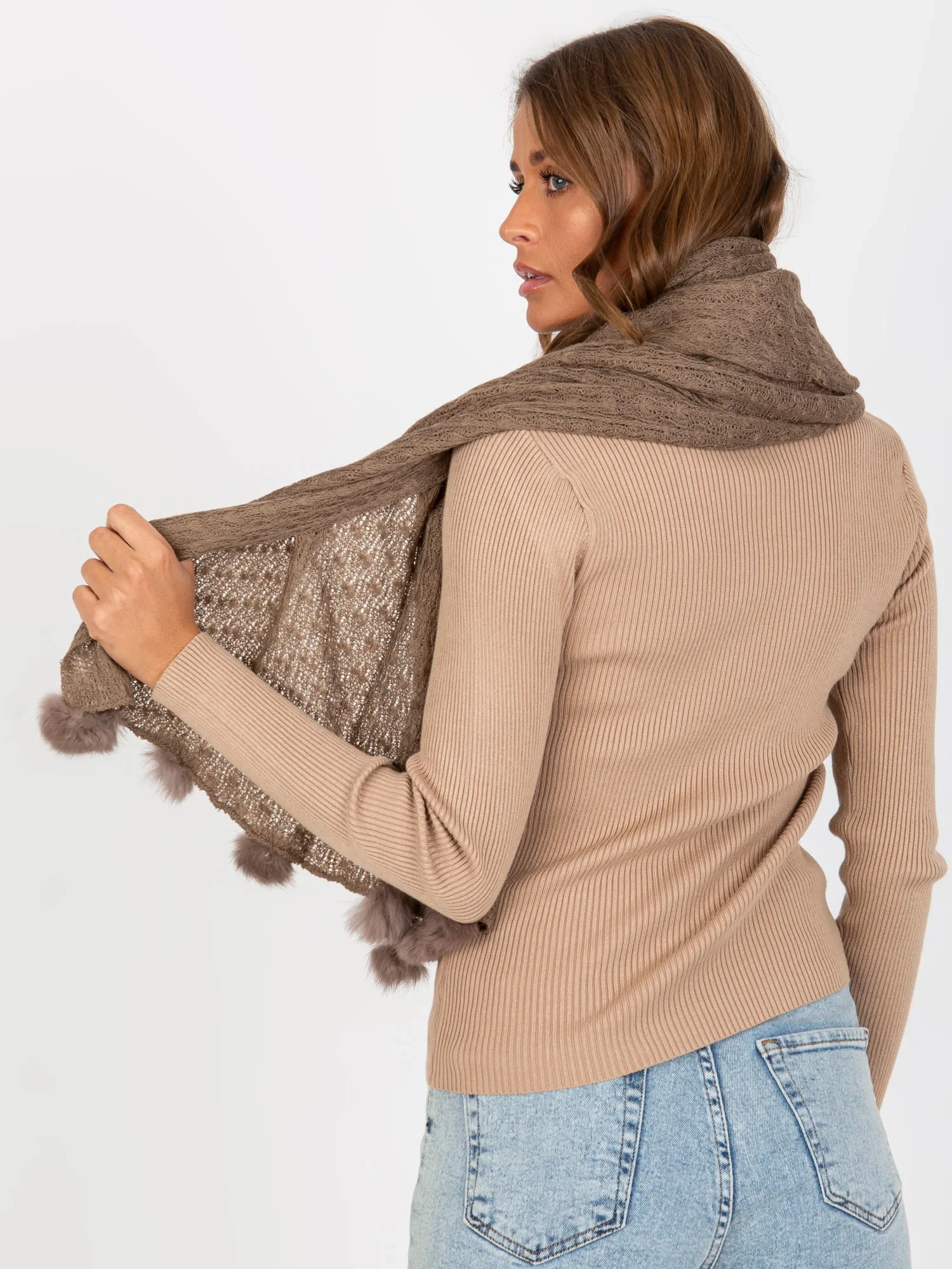 Tmavě béžový dámský šátek s prolamovaným vzorem .