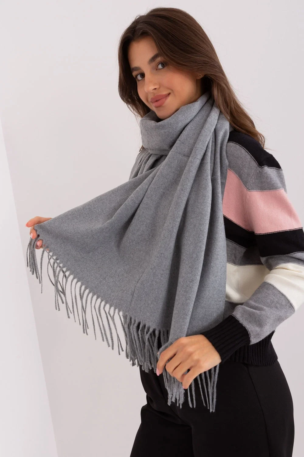 Hřejivá dlouhá šála s ozdobnými střapci, ideální na zimu.