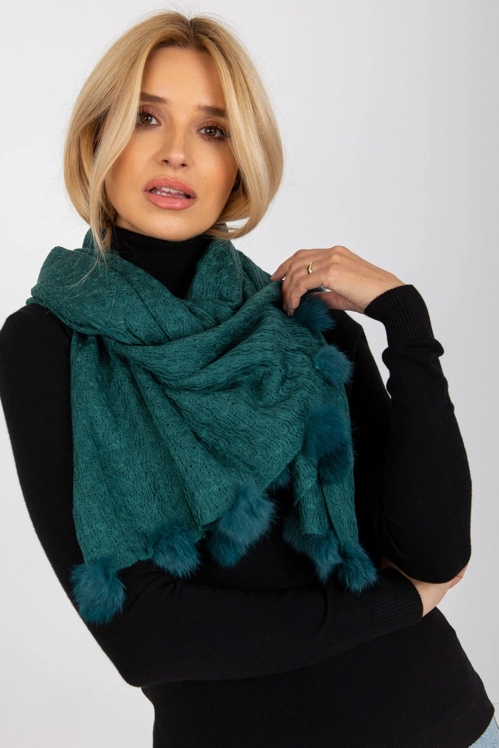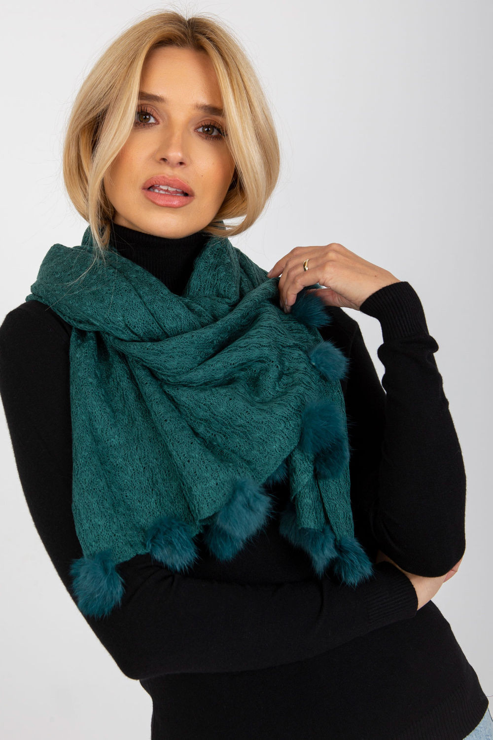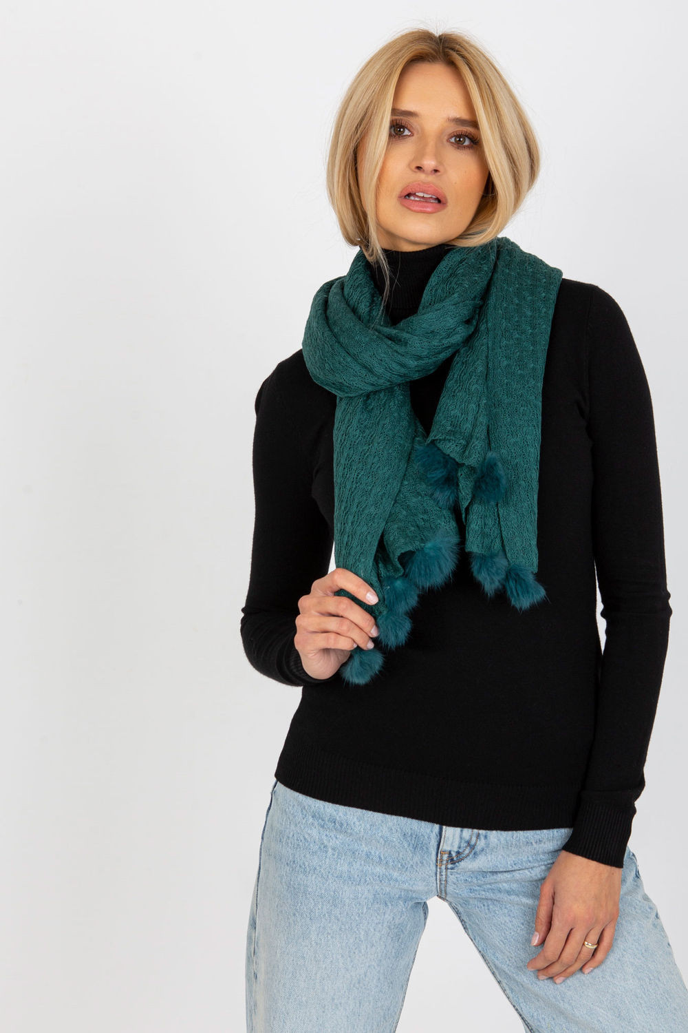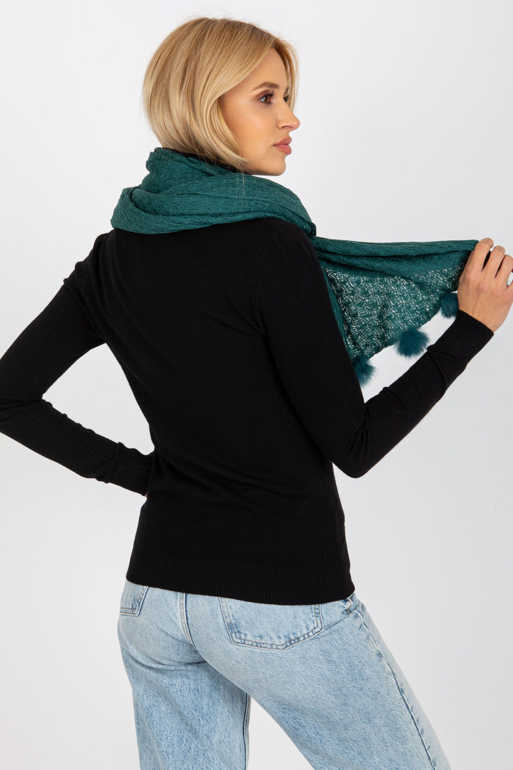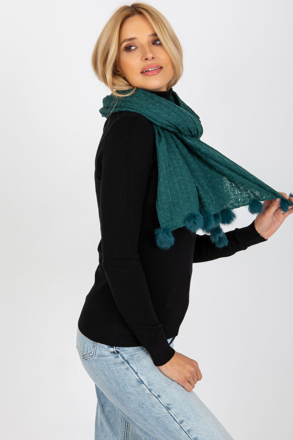 Ažurová dlouhá šála s ozdobnými bambulkami, ideální na zimu.