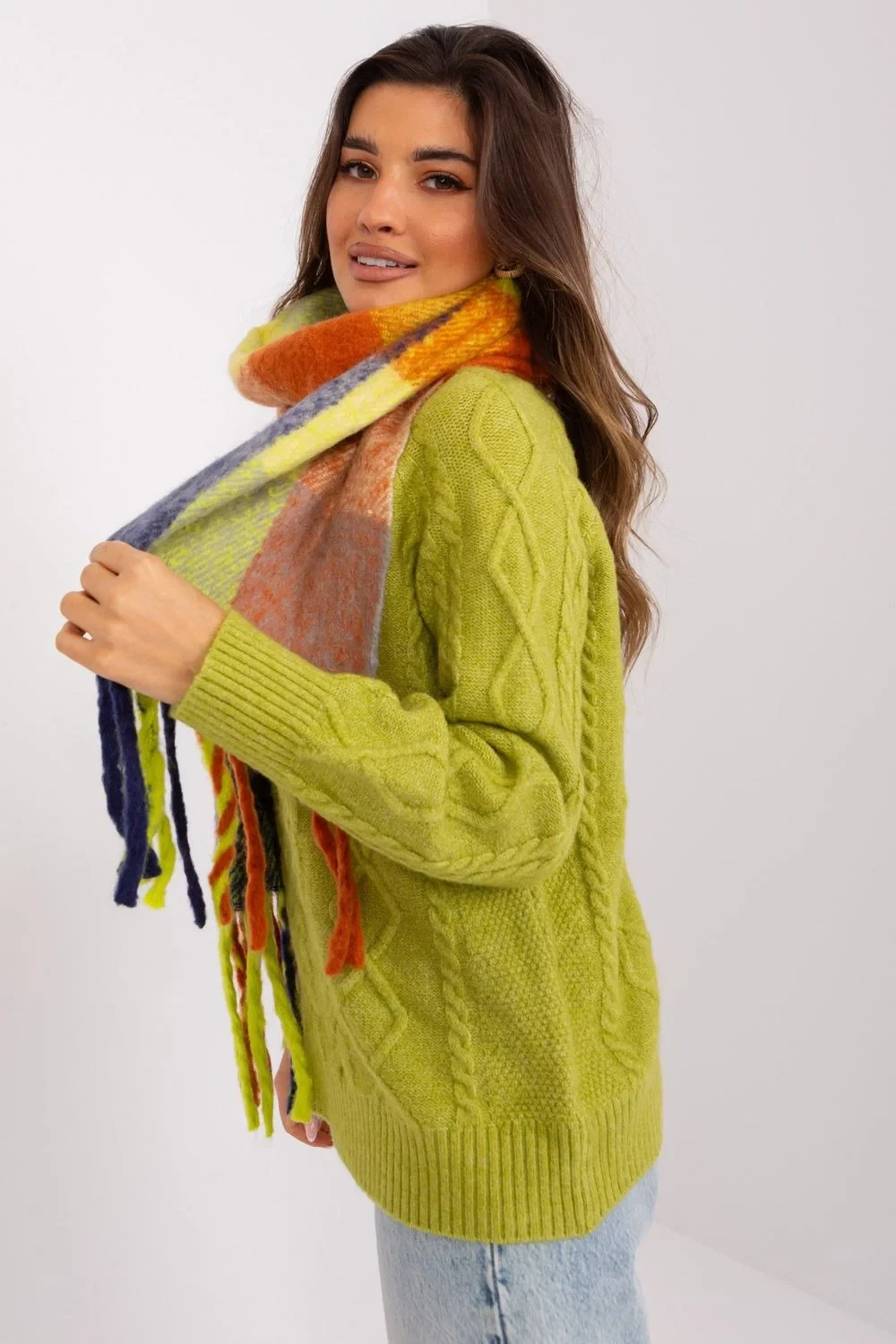 Tato dlouhá barevná kostkovaná šála je dokonalým doplňkem vašeho podzimního/zimního šatníku. Je vyrobena z odolného polyesteru a je nejen praktická, ale také stylová. Střapce jí dodávají jemnost a lehkost. Délka šály umožňuje různé způsoby nošení, můžete si ji omotat kolem krku, nechat ji volně na ramenou nebo ji použít jako další vrstvu v chladnějších dnech. Ať už ji budete nosit jakkoli, tato šála bude stylovým doplňkem vašeho šatníku a dodá mu charakter a teplo.