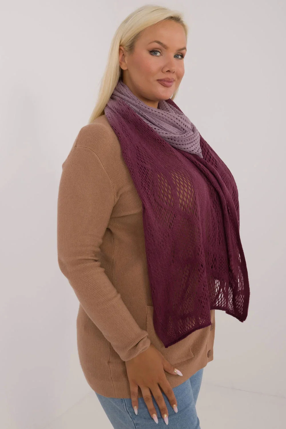 Ažurová šála dlouhá 190 cm je elegantní a stylový doplněk, který se skvěle hodí do chladnějších dnů. Je vyroben z kombinace bavlny a vlny, takže poskytuje vynikající teplo a pohodlí při nošení. Jemný prolamovaný vzor mu dodává lehkost a decentní nádech, což z něj činí jedinečný kousek šatníku. Šála je dlouhá, což umožňuje různé stylizace a nošení na mnoho způsobů a dodává šik nádech každodenním i elegantnějším outfitům. Je to kombinace funkčnosti a módního vzhledu, ideální na podzim a zimu.