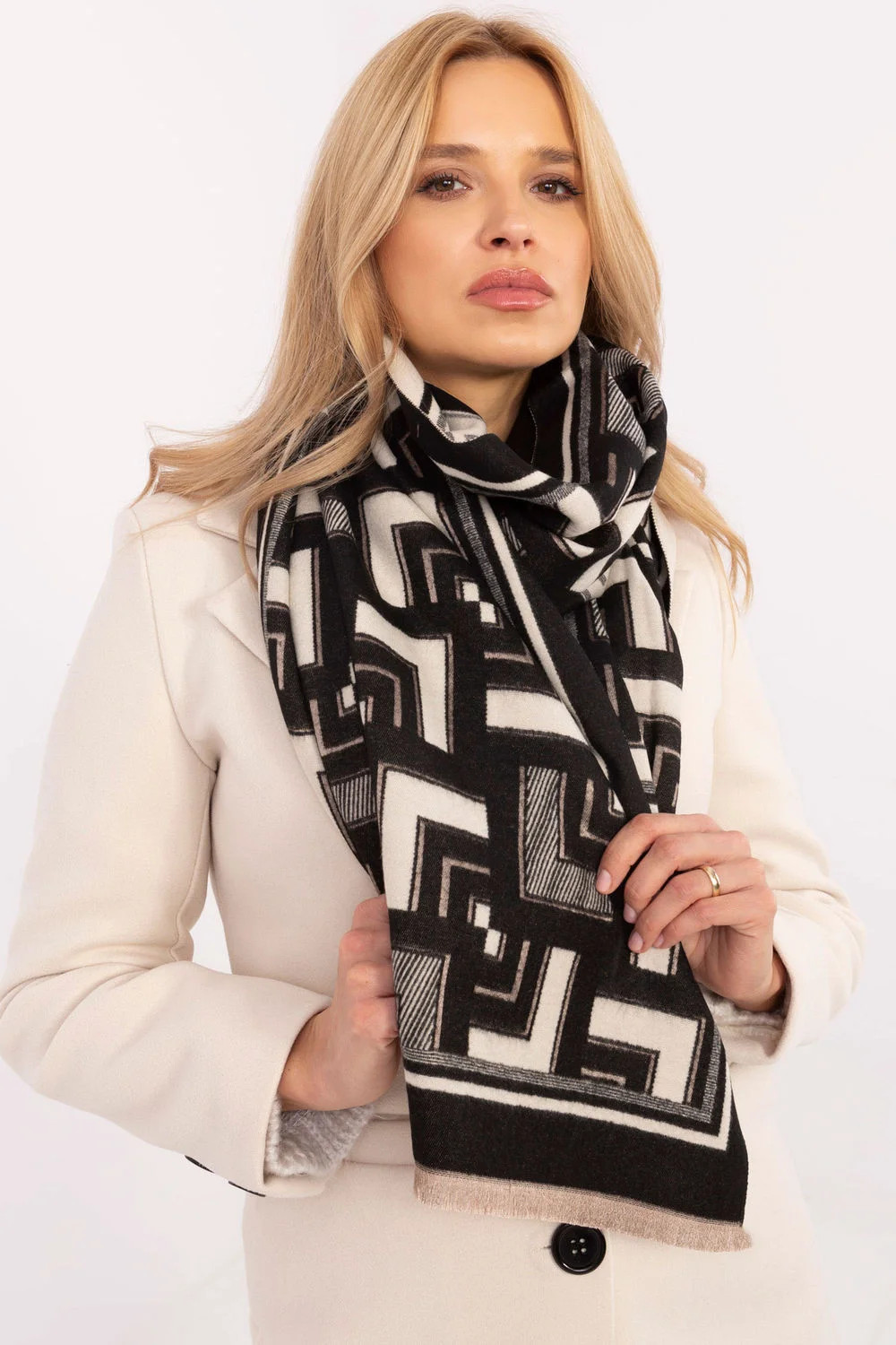 Elegantní šátek o délce 190 cm vyrobený z měkké a příjemné viskózy. Vyznačuje se geometrickým vzorem, který dodává každému outfitu modernost a eleganci. Jemné, malé šňůrky na koncích šátku mu dodávají lehkost a originalitu. Ideální na chladnější dny, skvěle se hodí jak do každodenního, tak do více elegantního outfitu.