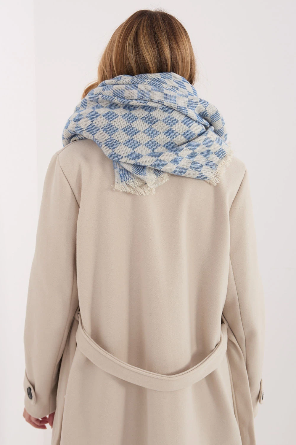 Šátek vyrobený z vysokokvalitní směsi viskózy a vlny potěší příjemnou strukturou na dotek a elegantním dokončením. Jeho geometrický, dominující vzor dodává celku moderní charakter. Model má impozantní rozměry 148 × 148 cm, díky čemuž ho lze nosit různými způsoby, jak jako klasický šátek, tak jako stylový šátek. Dalšímu šarmu dodávají jemné franže, které zdůrazňují lehkost a svobodu stylizace.