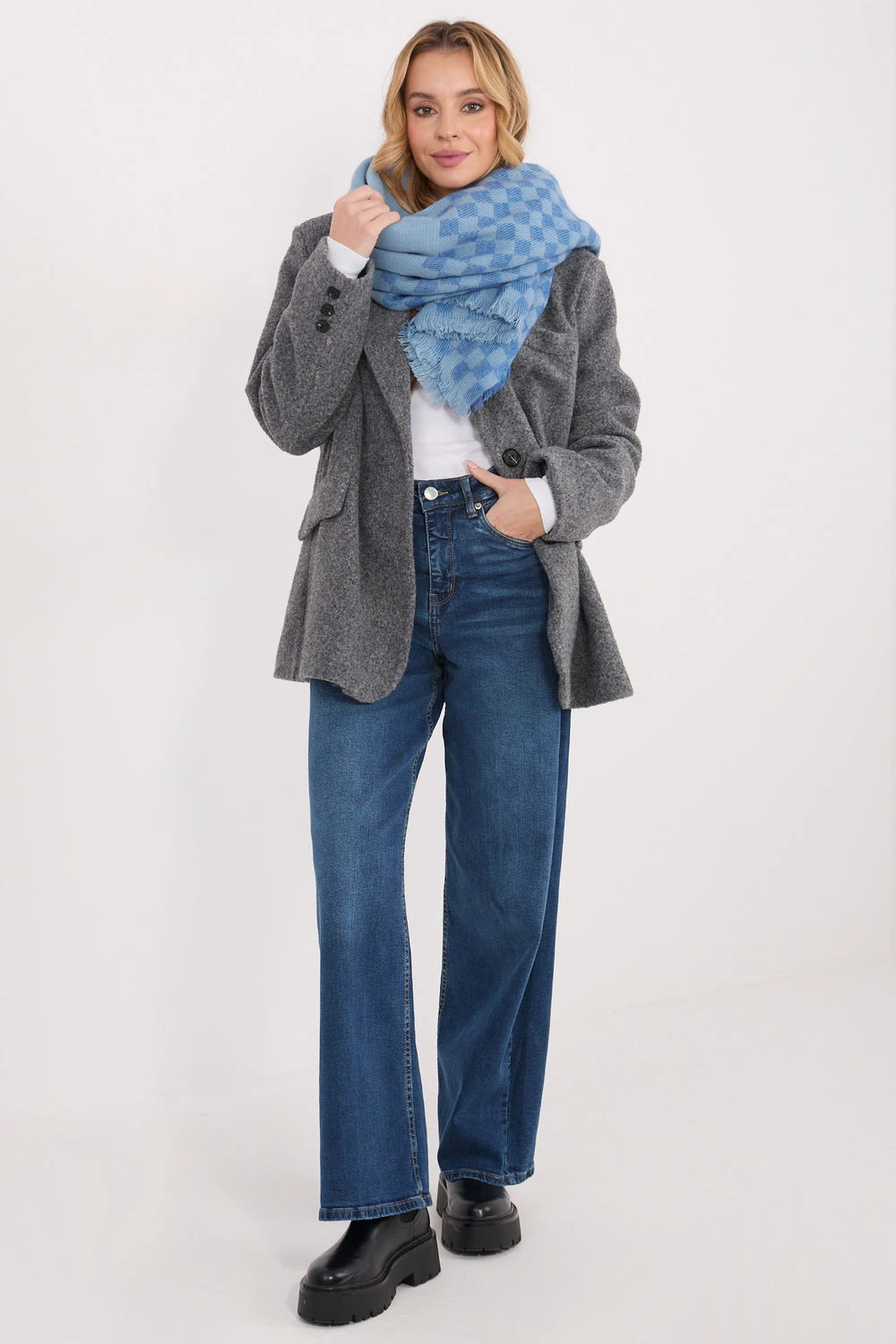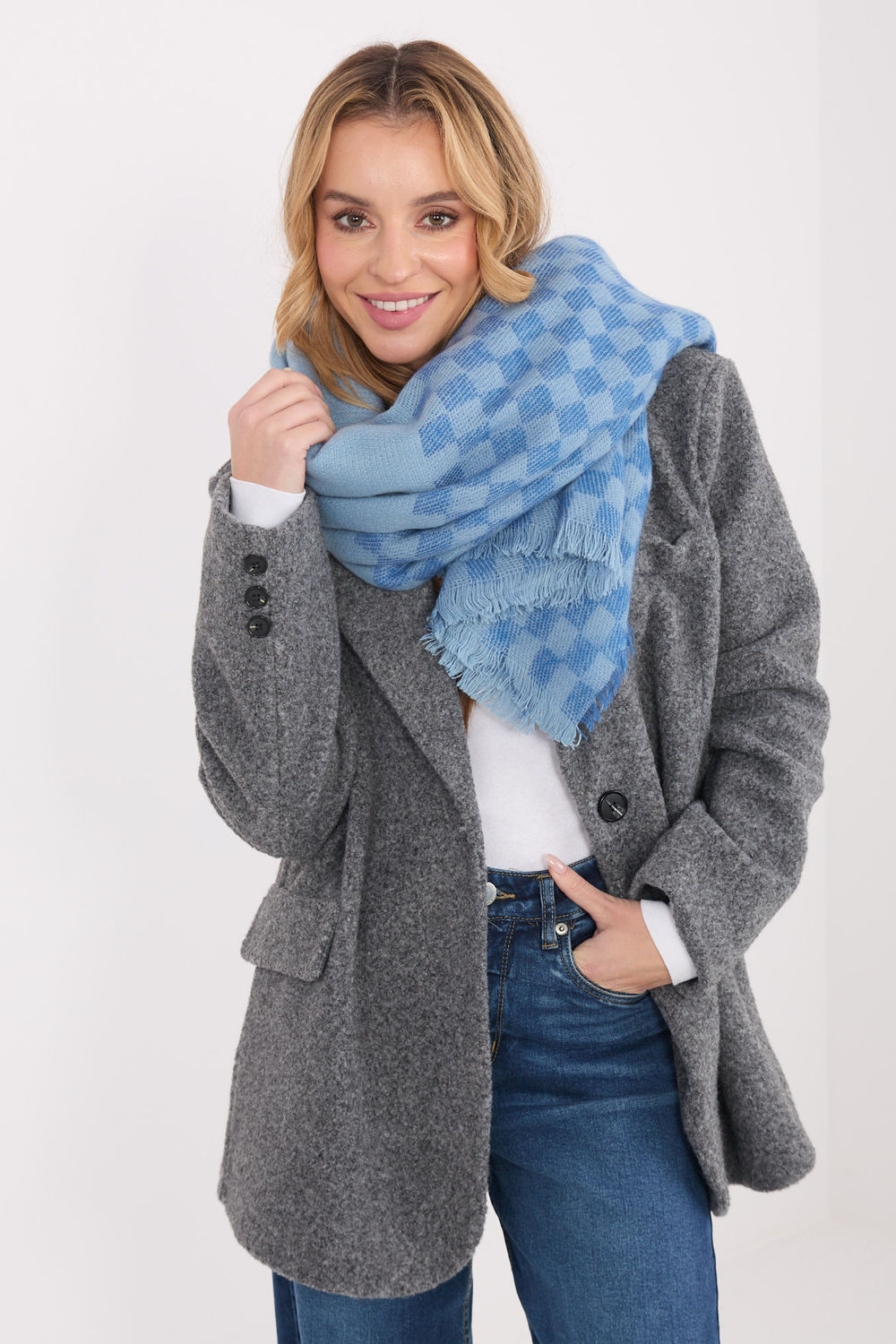 Šátek vyrobený z vysoce kvalitní směsi viskózy a vlny potěší příjemnou texturou a elegantním provedením. Jeho geometrický, dominantní vzor dodává celku moderní charakter. Model má impozantní rozměry 148 × 148 cm, díky čemuž ho lze nosit různými způsoby, jak jako klasický šátek, tak i stylový šátek. Dalšímu šarmu dodávají jemné řasící, které zdůrazňují lehkost a svobodu stylizace.