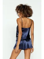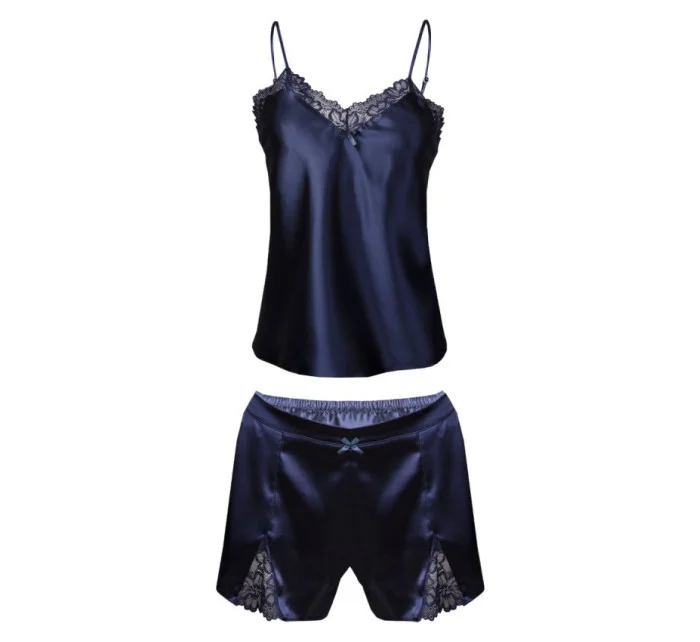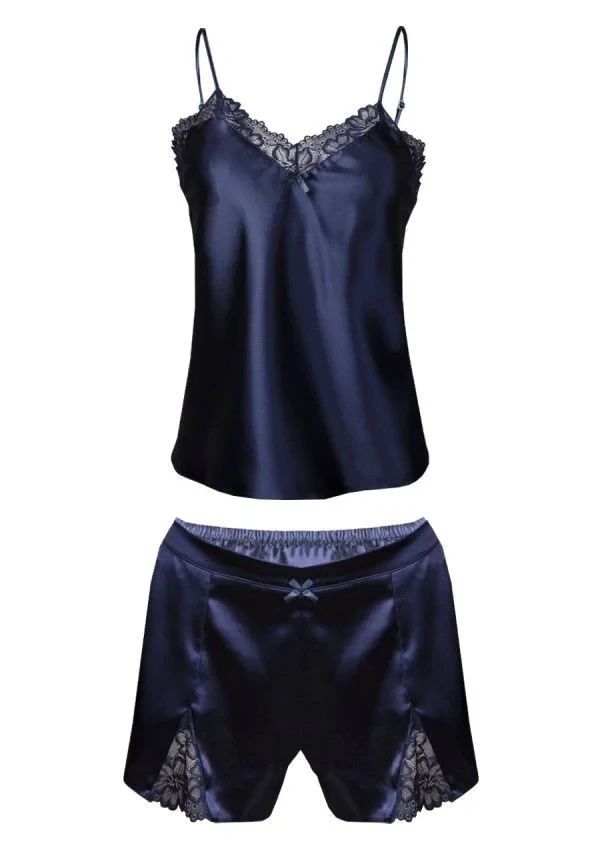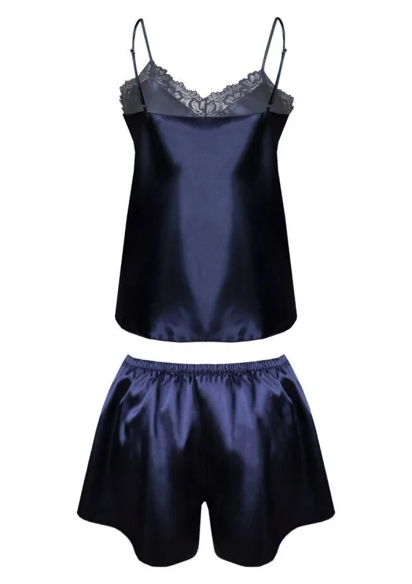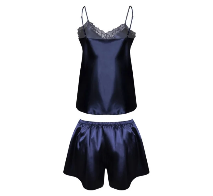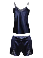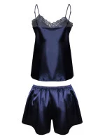 Elegantní dvoudílná souprava z tmavě modrého saténu a černé krajky. Okouzlí vás jak svou sofistikovanou barvou, tak úžasnou jemností vepsanou do tohoto designu. Souprava se skládá z pohodlného topu na tenkých, nastavitelných ramínkách s krásným krajkovým výstřihem a volných šortek na měkkou gumu s krajkovými vsadkami na stehnech. 100% polyester.