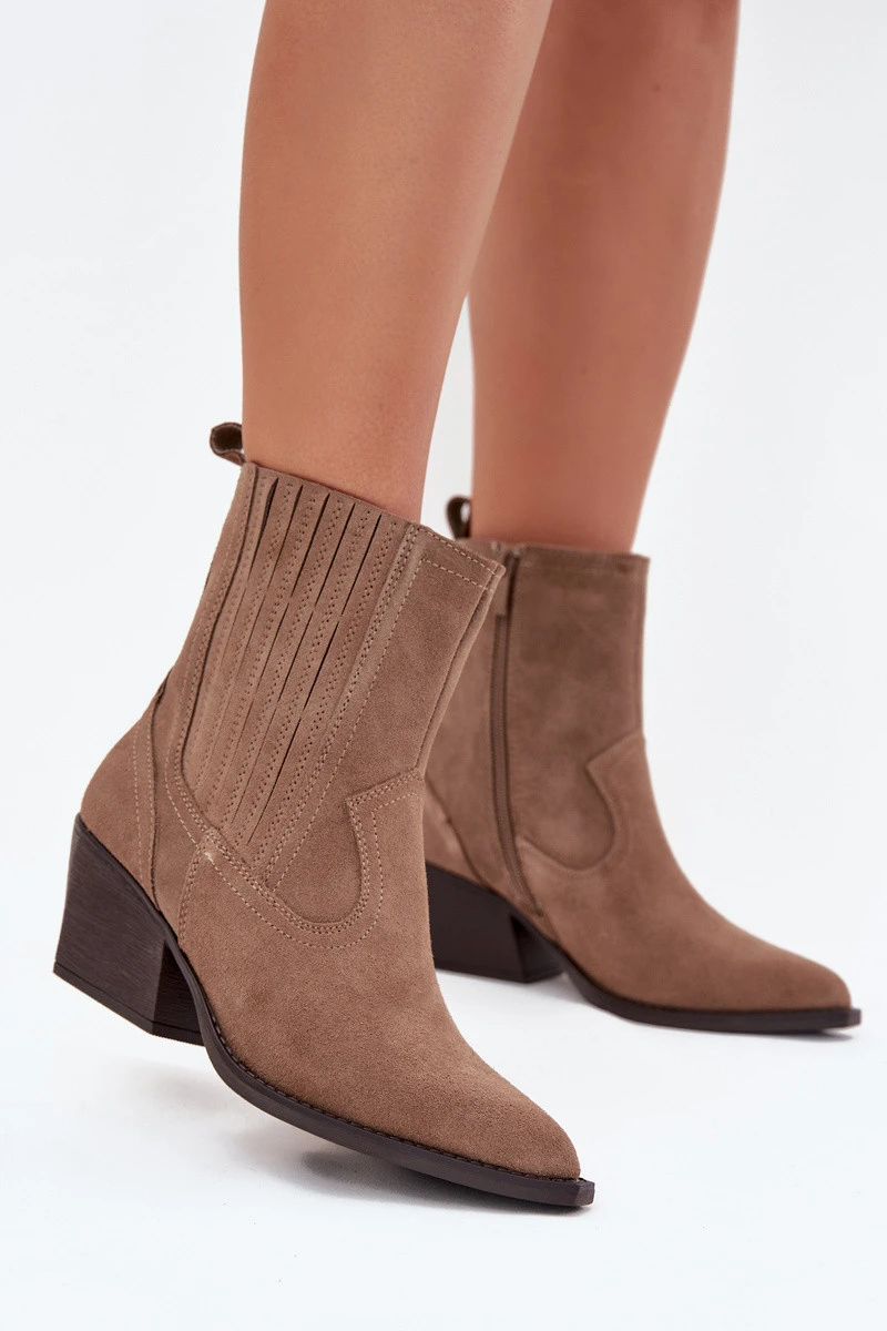 Dámské cowboy boty z přírodní semišové kůže jsou jedinečným návrhem, který spojuje styl a pohodlí. Špičaté špičky jim dodávají charakteristický vzhled, a zateplení obuvnickou vlnou zajišťuje teplo v chladnějších dnech. Zip umožňuje pohodlné obouvání, a sloupcový podpatek zajišťuje stabilitu a pohodlí při chůzi. Ideální pro každodenní stylizace, tyto boty dodají každému vzhledu jedinečný akcent. Při výběru velikosti prosíme řídit se tabulkou velikostí. Při výběru velikosti se řiďte tabulkou velikostí.