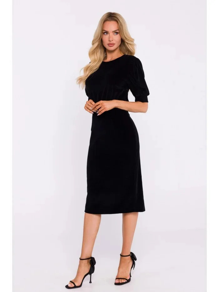 80% bavlna 20% polyester INFORMACE O PRODUKTU: pletenina - sametové pouzdrové šaty přetažené přes hlavu délka pod kolena krátké rukávy s manžetami skrytý boční zip bez podšívky naše modelka je vysoká 171 cm a nosí velikost S navrženo a vyrobeno v Polsku