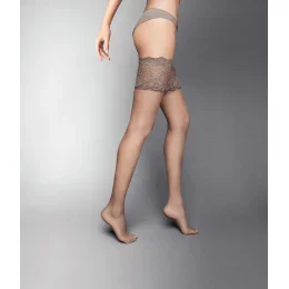 Dámské samodržící punčochy, matné, průsvitné, o síle 20 Den. Okraje jsou zakončené širokou krajkou (10 cm) s květovaným motivem. Z vnitřní strany je dvojitý pásek silikonu.Prsty bez zpevnění.