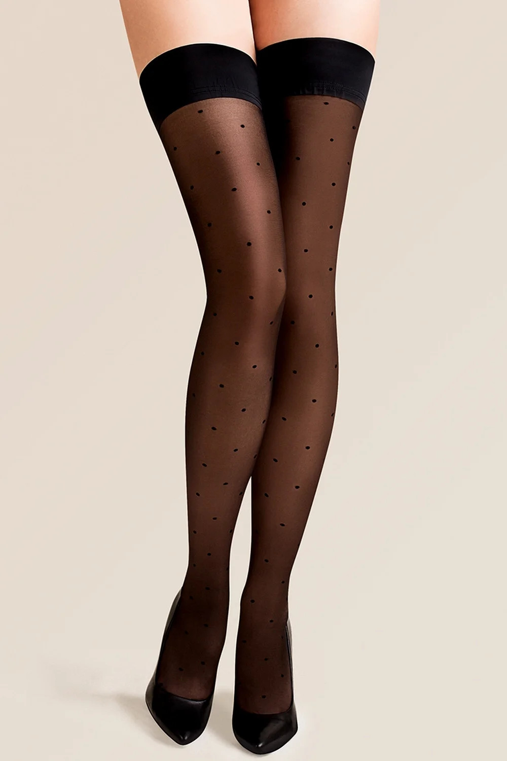 Tenké, jemně puntíkované punčochy 629 Puntina Gabriella - nemají vyznačenou špičku - jsou vyrobené s přídavkem lycry - 7 cm široký silikonový pásek - 20 DEN