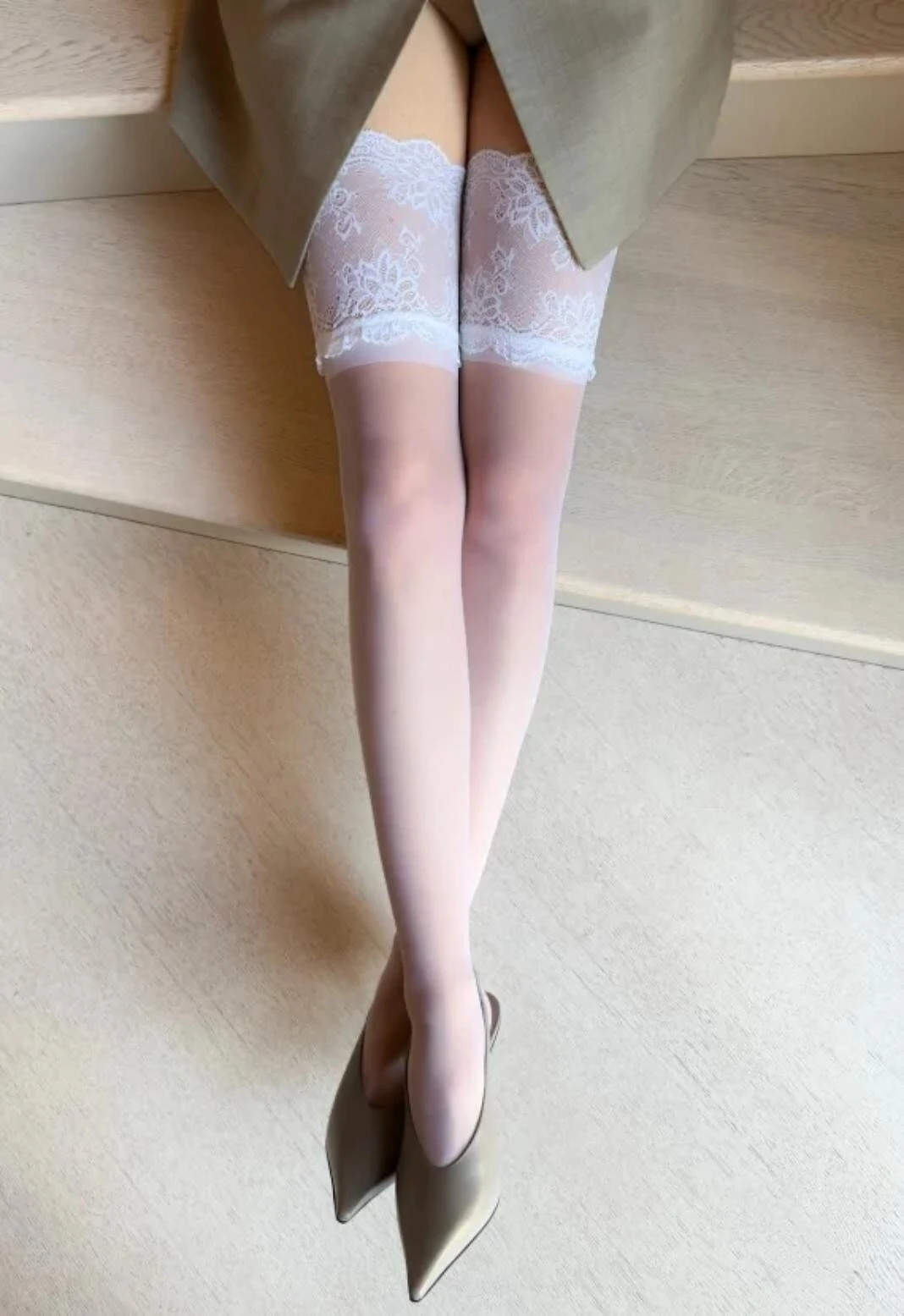 Dámské samodržící punčochy, matné, průsvitné, o síle 20 Den. Okraje jsou zakončené širokou krajkou (10 cm) s květovaným motivem. Z vnitřní strany je dvojitý pásek silikonu.Prsty bez zpevnění.