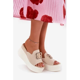 Stylové dámské pantofle na masivní platformě a klínu. Vyrobené z příjemného eko semiše. Měkká stélka je vyrobena z eko kůže. Vpředu ozdoba, která dodává eleganci. Tyto pantofle jsou skvělou volbou na letní, horké dny! Při výběru velikosti se řiďte tabulkou velikostí.