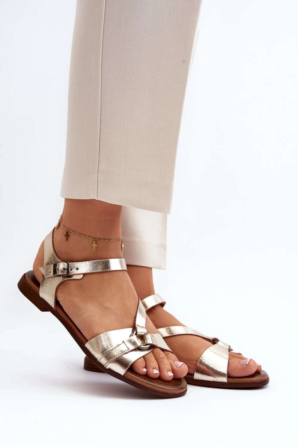 Dámské sandály z přírodní kůže. Stojí na plochém podpatku. Zapínají se na nastavitelný pásek s přezkou. Kožená stélka zajistí pohodlí při používání. Ideální pro horké dny. Nezbytná součást vašeho letního šatníku!