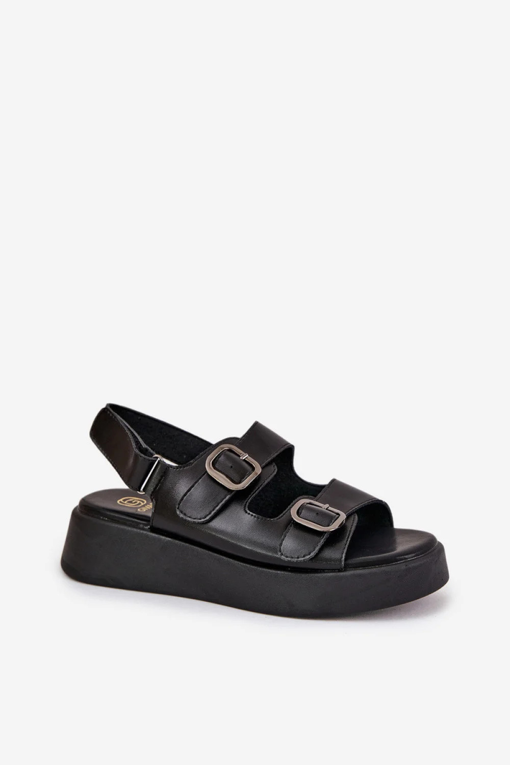 Stylové dámské sandály vyrobené z ekokůže. Umístěné na platformě a jemném podpatku, které spojují eleganci s pohodlím. Zapínají se na suchý zip vzadu, což zajišťuje snadné obouvání a svlékání, a nastavitelné popruhy s přezkami vpředu umožňují ideální přizpůsobení noze. Měkká stélka zaručuje pohodlí po celý den. Tyto žabky budou skvělou volbou na teplé dny, skvěle ladící s šaty, sukněmi nebo kalhotami.