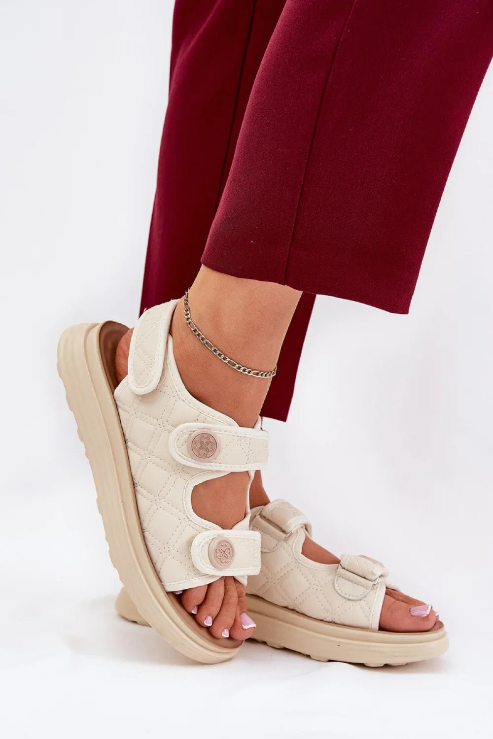 Stylové dámské sandály z ekokůže. Usazeny na platformě, která poskytuje pohodlí a módní vzhled. Uzavírání na tři suché zipy umožňuje perfektní přizpůsobení noze. Dekorativní detaily dodávají jedinečný charakter. Skvělé na léto, skvěle ladí s letními šaty, sukněmi a kalhotami, dodávají každému outfitu lehkost a módní vzhled.