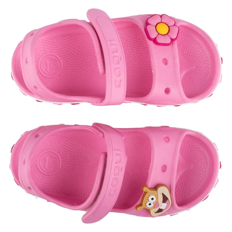 Materiał CoquiAir (najwyższa klasa materiałów EVA) Amortyzacja Antybakteryjna powierzchnia Antypoślizgowa i niebrudząca podeszwa Mocny pasek na pięcie Jeden pasek z regulacją na rzep Możliwość personalizacji za pomocą przypinek Amuletz W zestawie przypinka z postacią z animacji Spongebob Squarepants