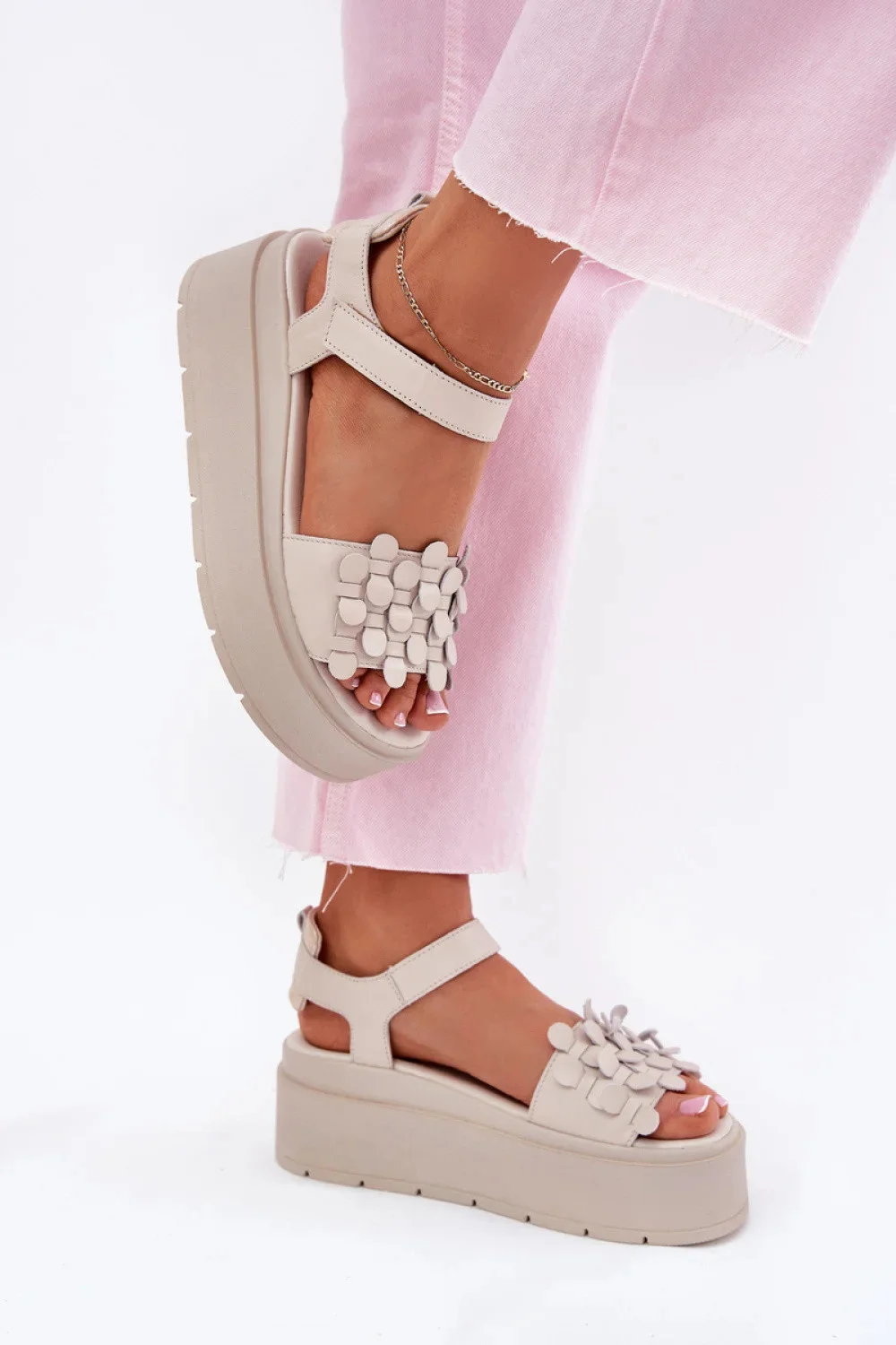 Dámské sandály značky Chebello vyrobené z přírodní kůže jsou elegantní a pohodlnou volbou pro teplé dny. Na platformě, která jemně zvedá postavu, poskytují pohodlí a lehkost. Zapínání na suchý zip umožňuje snadné přizpůsobení noze. Ideální pro každodenní outfit, spojují módní vzhled s funkcionalitou.