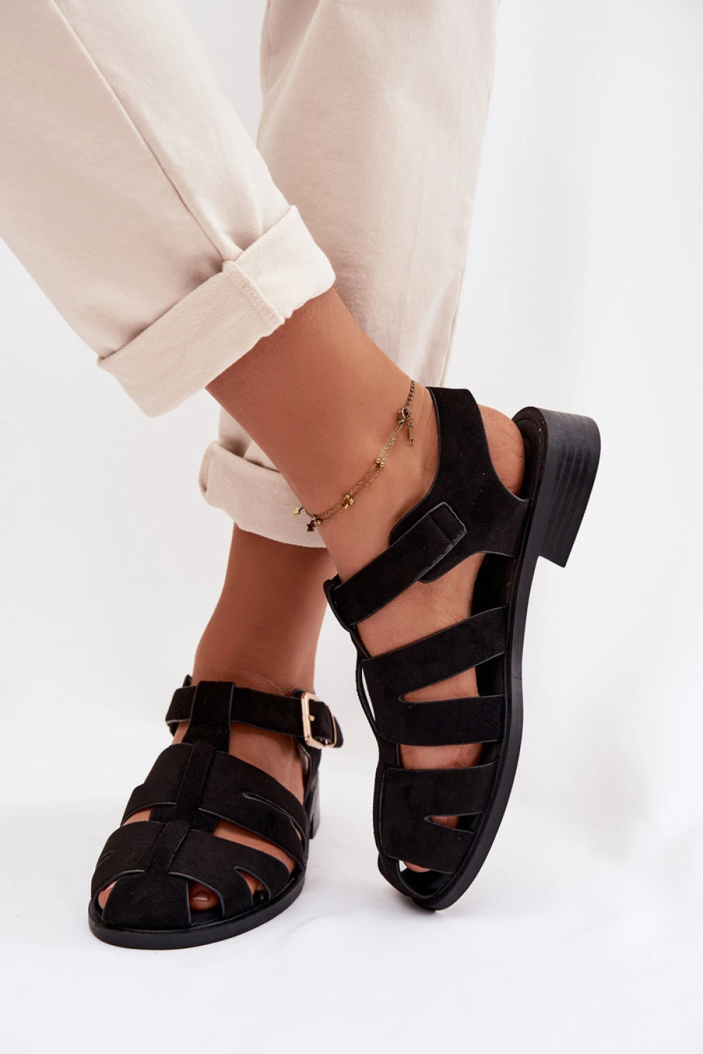 Elegantní dámské sandály typu římské sandály jsou nadčasovou nabídkou na letní dny. Plochý podpatek zajišťuje pohodlí po celý den a nastavitelný popruh s pozlacenou přezkou umožňuje perfektní přizpůsobení bot k noze. Klasický střih inspirovaný římskými sandály dodává outfitům lehkost a eleganci, což znamená, že sandály se skvěle hodí do každodenních letních sestav.