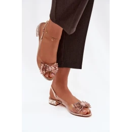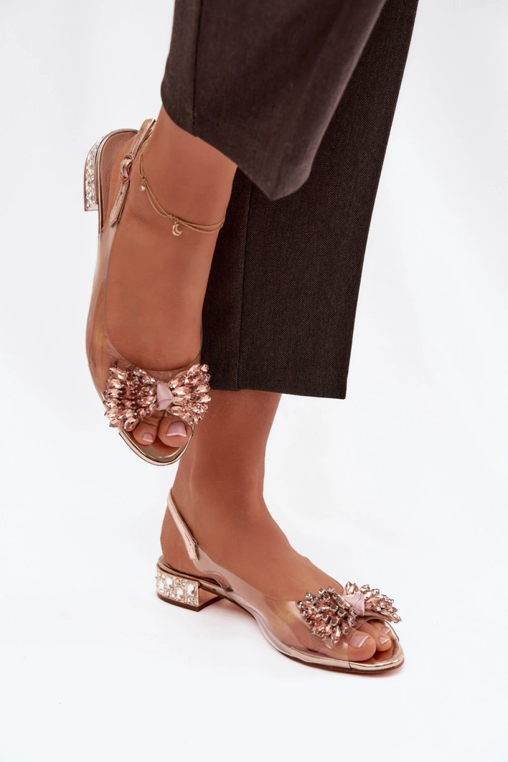 Průhledné dámské sandály jsou skvělou volbou na speciální příležitosti. Nízký podpatek zdobený křišťály jemně září, dodávajíc celku bižuterní charakter a lehkost. Vepředu upoutá pozornost efektní mašlička s křišťály, která zdůrazňuje ženský a elegantní styl modelu. Zapínání na sponu s nastavitelným řemínkem umožňuje přesné přizpůsobení k noze, zajišťující pohodlí a stabilitu při nošení. Sandály se skvěle hodí jako doplněk k večerním stylizacím, elegantním šatům a kreacím na slavnostní události.