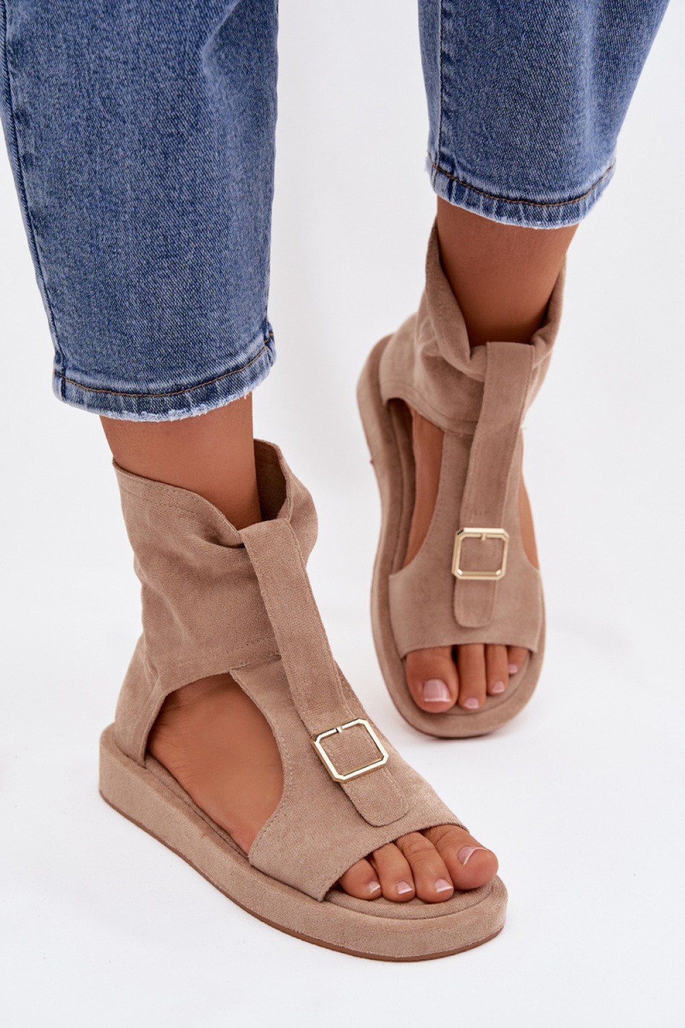 Sandalové boty z eko nubuku jsou stylovým návrhem na teplé dny a výjimečné příležitosti. Měkký materiál jim dodává jemný vzhled a svršek se zapínáním na zip v zadní části zajišťuje pohodlí a rychlé oblékání. Přední část boty zdobí efektní pásek se zlatou sponou, který přitahuje pozornost a dodává celku elegantní charakter. Tento model skvěle doplní jak každodenní, tak i formálnější stylizace.
