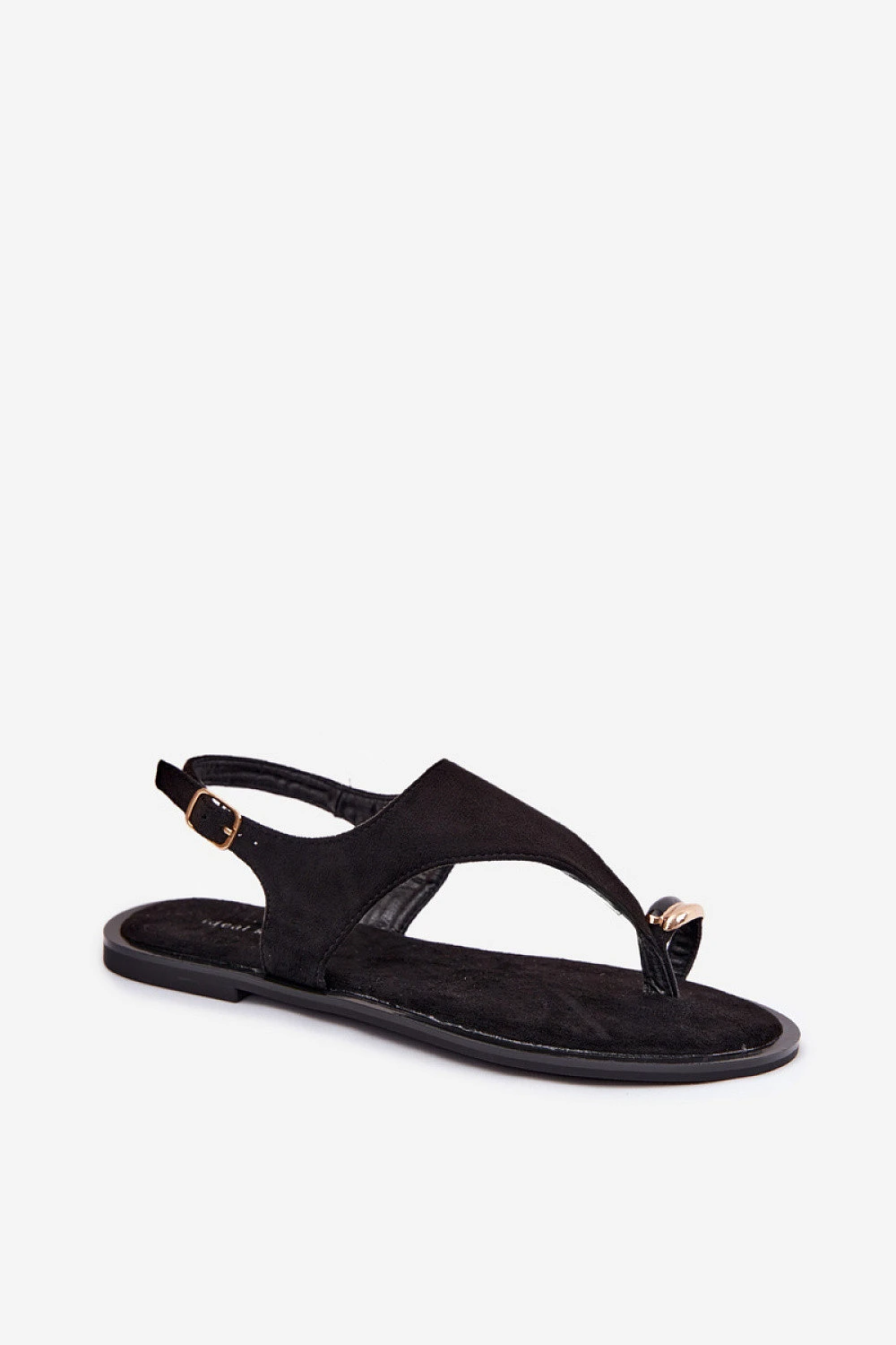 Dámské sandály z ekosuede jsou stylovým a pohodlným návrhem na letní dny. Jejich lehký, plochý tvar je skvělý pro každodenní nošení, poskytující pohodlí a volnost. Jemný zlatý detail na prstech přitahuje pozornost a dodává celku elegantní akcent, který krásně zdůrazňuje stylizaci. Jemné zapínání na přezku umožňuje dobré přizpůsobení noze. Jedná se o univerzální model, který skvěle doplní letní outfit, od vzdušných šatů po příležitostné sestavy.