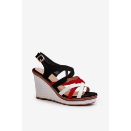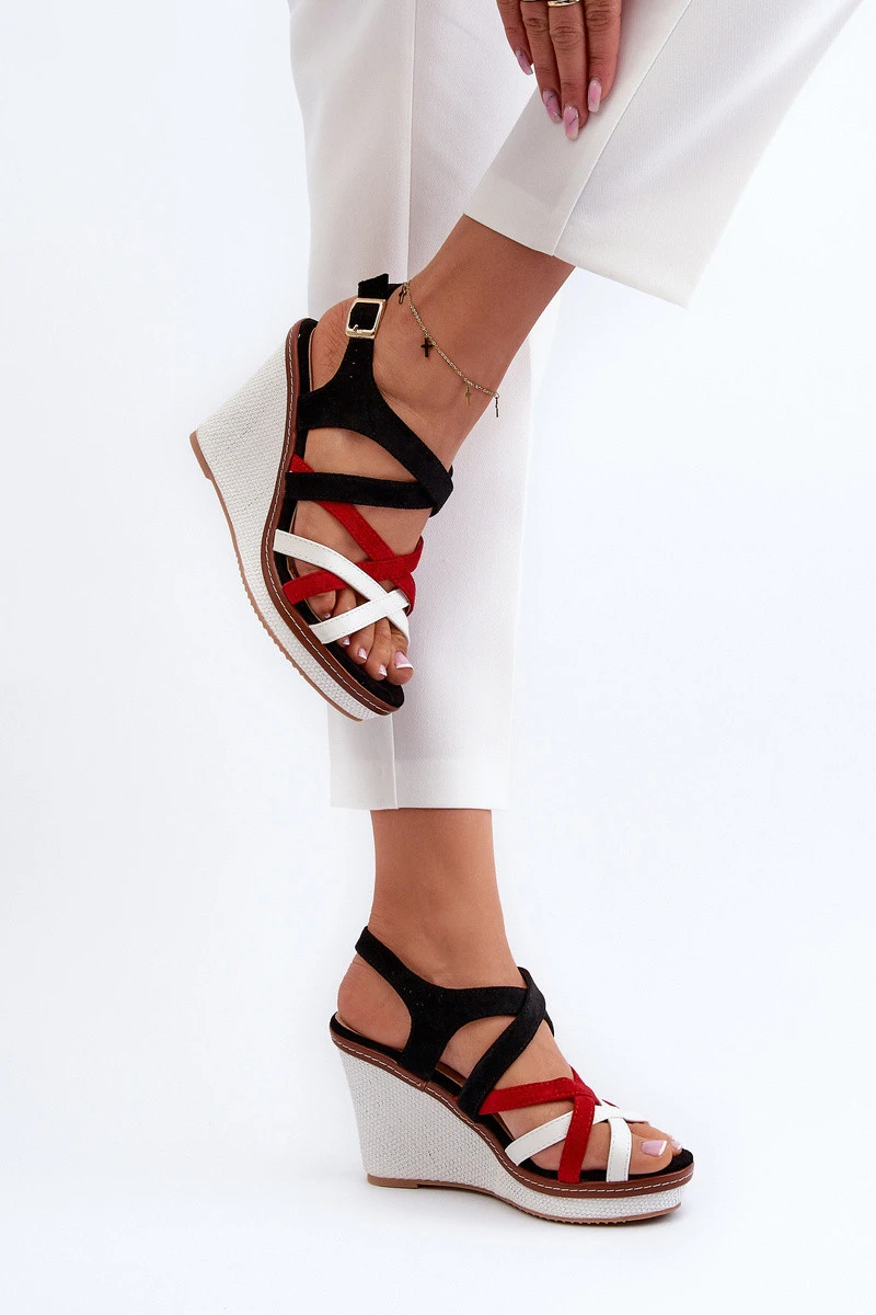 Jedinečné dámské sandály na platformě a klínech. Svršek je vyroben z eko kůže. Pruhy se vzájemně prolínají a vytvářejí jedinečný efekt. Boty mají měkkou stélku z ekokůže. Sandály se zapínají kolem kotníku na přezku s nastavitelným páskem. Podešev z plastu je protiskluzová, klínek a platforma jsou zdobeny prýmkem. Při výběru velikosti se prosím řiďte tabulkou velikostí.