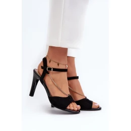 Dámské sandály z ekosuede s ozdobným řetízkem. Podpatek ve tvaru jehly. Díky nastavitelné přezce si je snadno přizpůsobíte své noze, což zajišťuje pohodlí při nošení. Tyto sandály jsou skvělou volbou pro mnoho různých příležitostí, přidávají eleganci a styl každému outfitu!