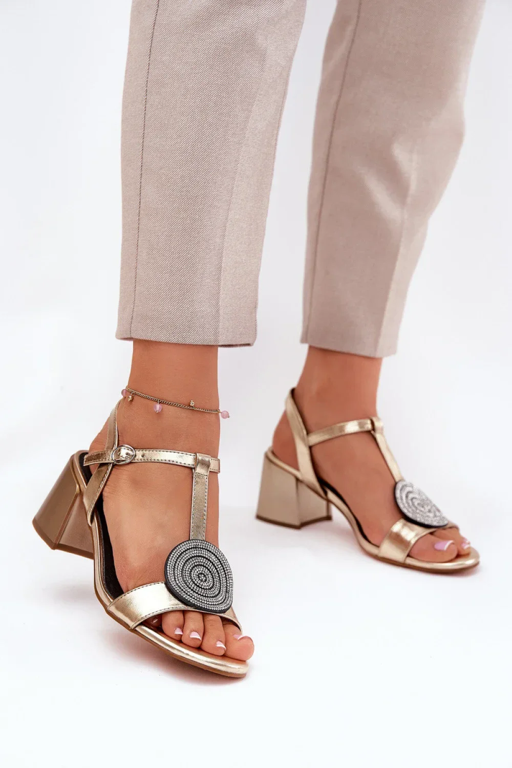 Dámské sandály z přírodní kůže, umístěné na sloupkovém podpatku, které spojují eleganci s pohodlím. Zapínání na přezku s nastavitelným páskem zajistí ideální přizpůsobení noze. Na přední části bot je ozdobný detail, který přitahuje pozornost a dodává jim výjimečný charakter. Tyto sandály budou skvělou volbou na speciální příležitosti, skvěle se hodí k šatům nebo elegantním kalhotám.