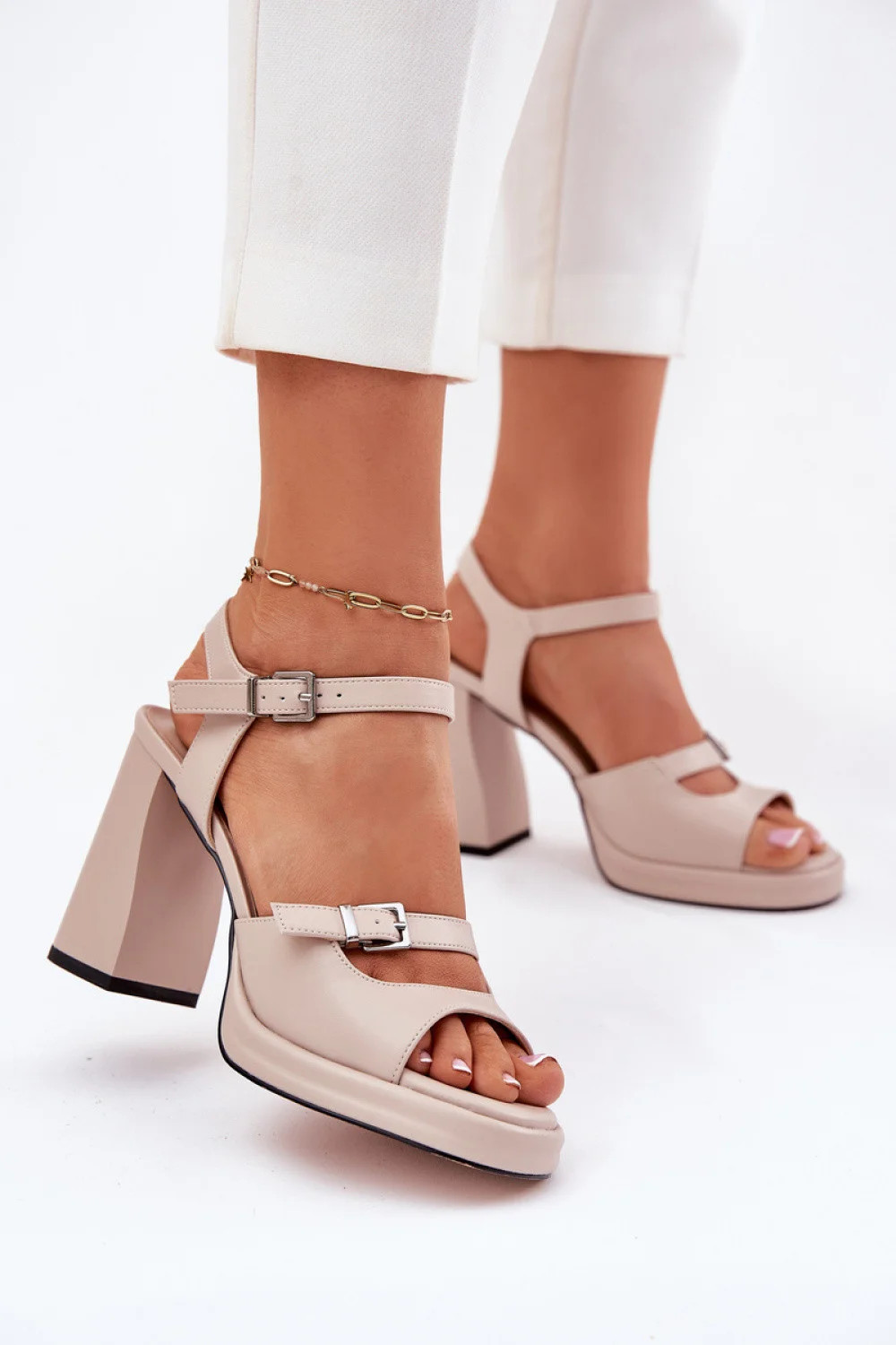 Elegantní dámské sandály vyrobené z přírodní kůže jsou skvělou volbou na speciální příležitosti. Umístěné na podpatku typu sloupek poskytují stabilitu a pohodlí po celý den. Vepředu je jemný popruh s přezkou. Zapínání kolem kotníku umožňuje perfektní přizpůsobení noze. Kožená stélka zaručuje pohodlí a správnou amortizaci. Tyto sandály budou skvělým doplňkem večerních a slavnostních stylizací, spojující styl a funkčnost.