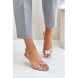 Dámské sandály s průhledným svrškem. Umístěné na sloupkovém podpatku. Vepředu je brož, která dodává eleganci. Měkká stélka je vyrobena z přírodní kůže. Ideální na různé slavnostní události.