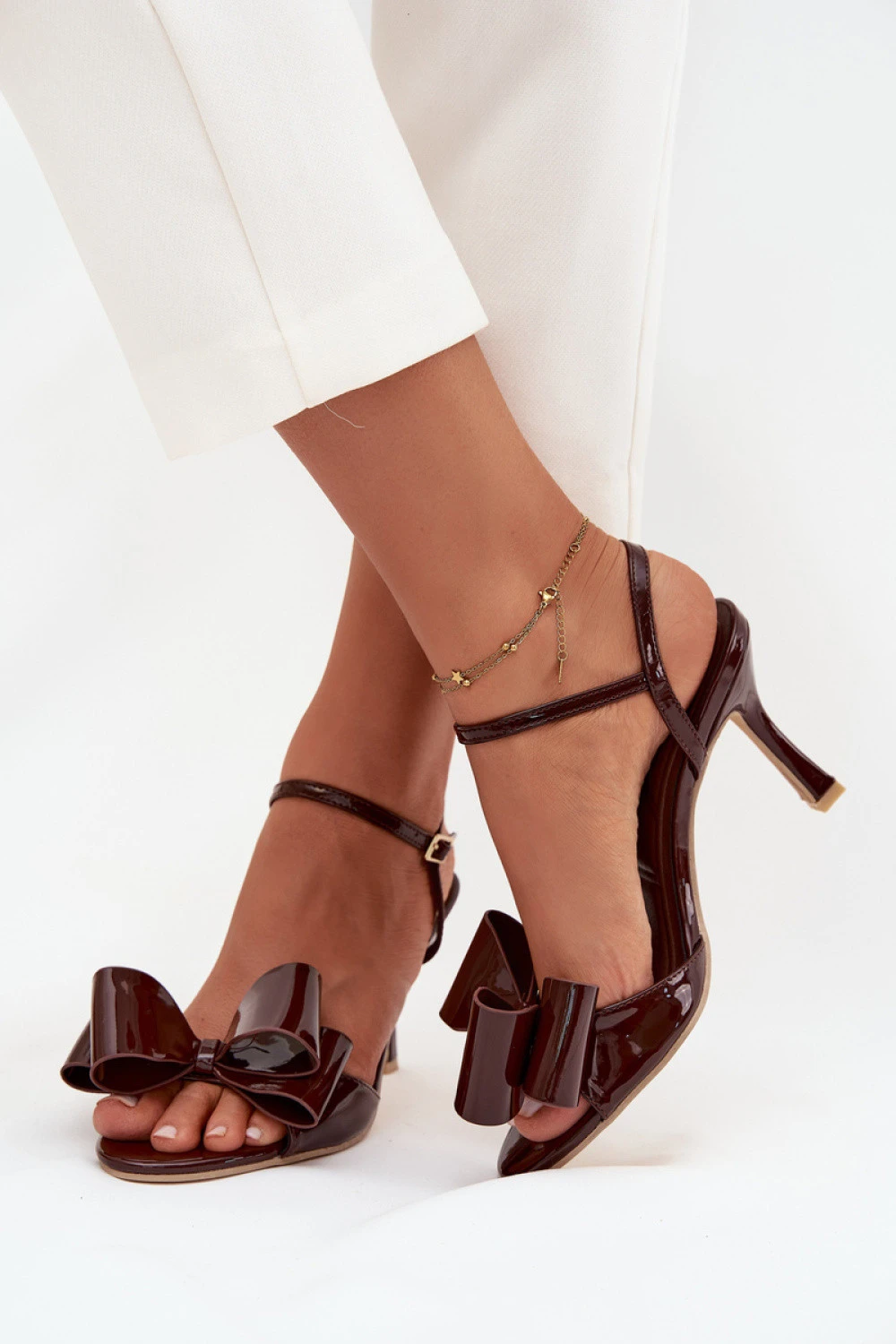 Dámské sandály vyrobené z kvalitní ekokože jsou spojením elegance a ženského stylu. Umístěné na štíhlém jehlovém podpatku krásně prodlužují postavu a dodávají lehkost každému outfitu. Nastavitelný pásek s přezkou umožňuje ideální přizpůsobení noze. Pozornost přitahuje ozdobná mašle umístěná vpředu, která dodává subtilní, dívčí kouzlo. Jedná se o model, který se skvěle hodí jak na výjimečné příležitosti, jako jsou večírky nebo slavnosti, tak i k elegantním večerním outfitům.