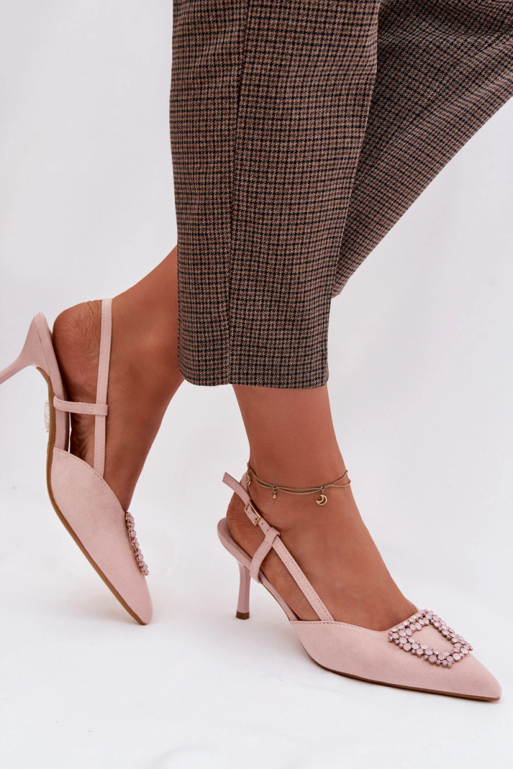 Eleganční dámské sandály z ekosuede jsou stylovým návrhem na výjimečné příležitosti. Tenký jehlový podpatek a špičaté špičky krásně zeštíhlují postavu a dodávají celku ženský charakter. Dekorativní detail vpředu přitahuje pohled a zdůrazňuje elegantní vzhled modelu. Nastavitelný pásek se sponou umožňuje ideální přizpůsobení sandálů k noze a zajišťuje pohodlné nošení. Tyto sandály se skvěle hodí na večírky, slavnostní události a večerní vycházky.